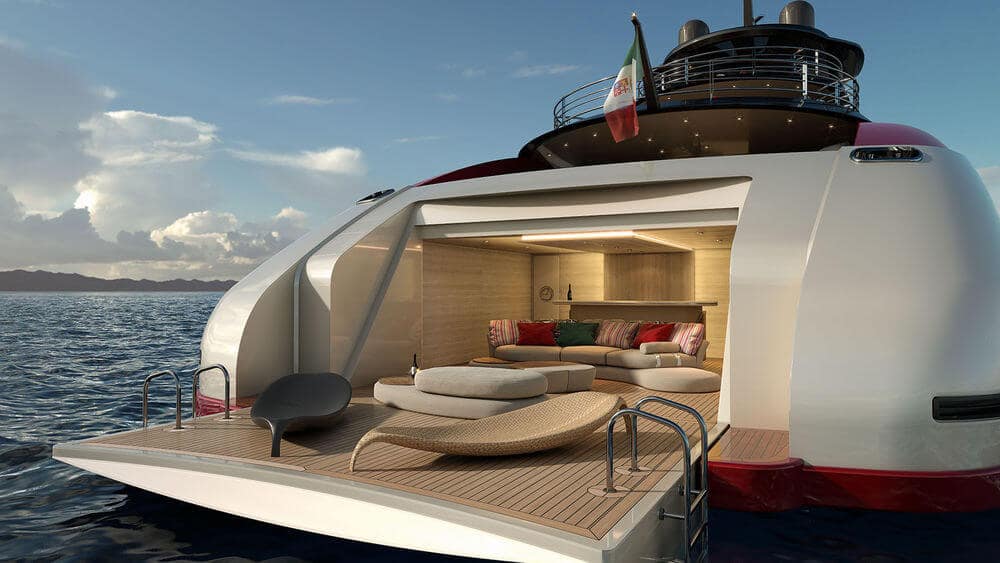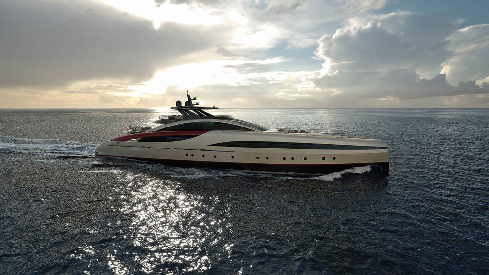 Fast, elegant and luxurious, the SeaFalcon is a 60-meter (197-foot) sport yacht created by Mondomarine and Luiz de Basto. It features a beautiful three-deck configuration, with the hull and main deck encapsulated in a mono-volume structure, and the upper deck and flybridge housed in a long arched volume. For extra visual appeal and dynamism, the hull is opened aft to expose a Tuscan red structural element.