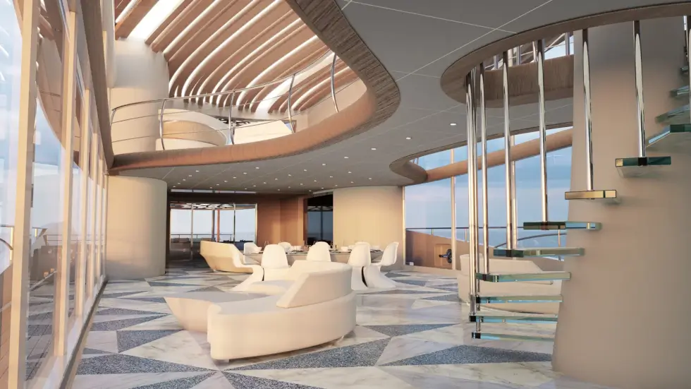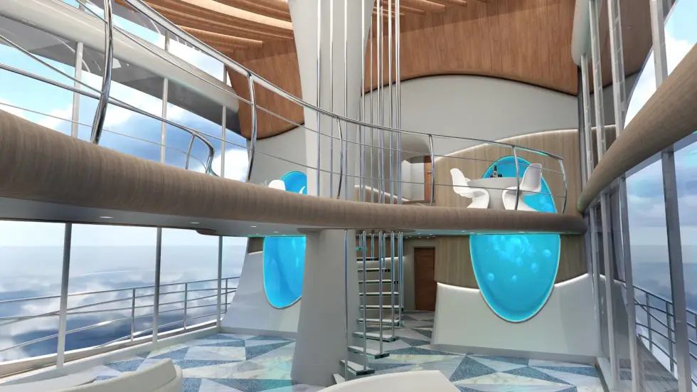 A 36-foot-wide beam suggests its volumes are brimming with luxurious appointments. A dual-deck lounge and entertainment area are highlighted by two massive jellyfish aquariums. Amenities include a gym, wellness center, an exterior swimming pool, Jacuzzi and more.