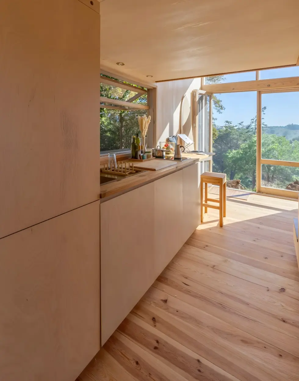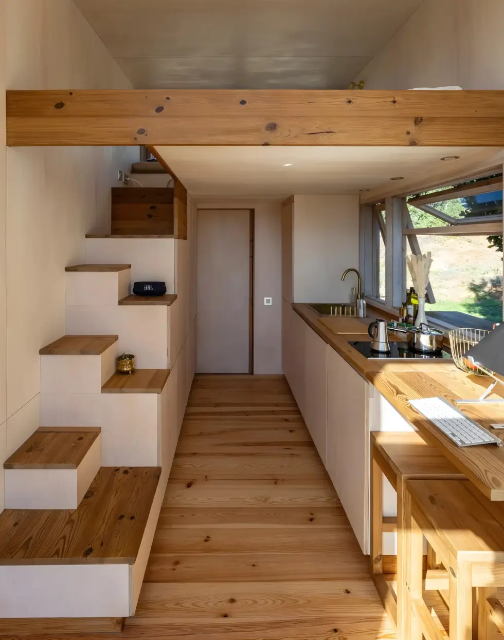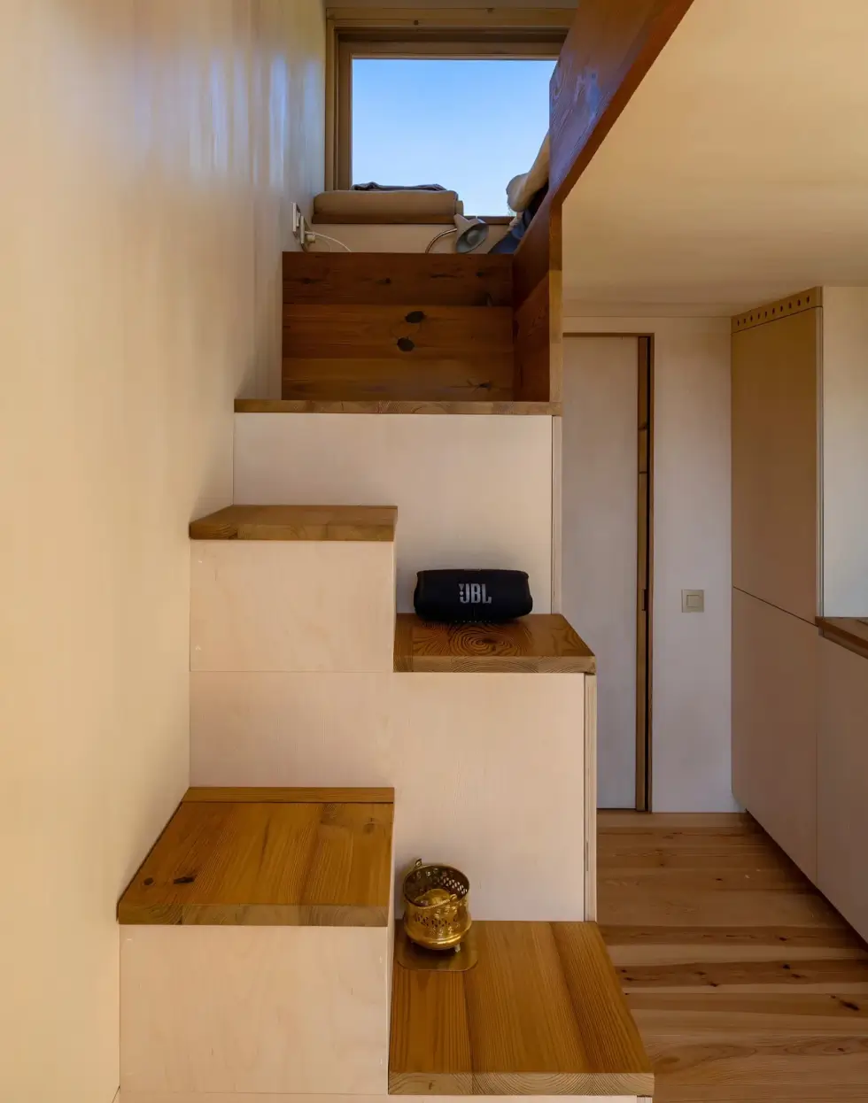 The house is clad in timber inside and out and reflects the studio’s signature blend of minimalism and modern convenience. Built on a double-axle trailer, it spans just six meters long. But through thoughtful and careful organized design, it feels spacious, cozy, and inviting.