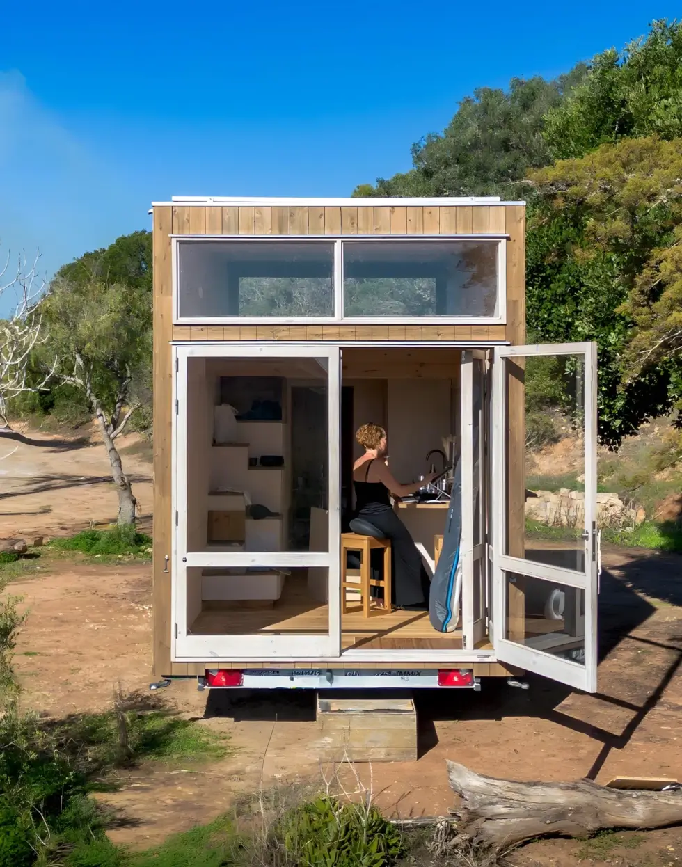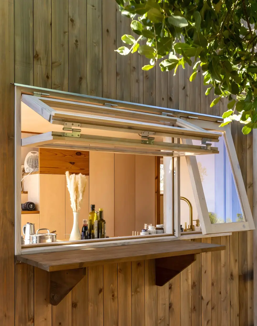 Duna tiny house has an induction cooktop, a hidden refrigerator, and generous prep space. A large folding window by the counter brings in fresh air and becomes a serving window for food and drinks to pass back and forth between the kitchen and the outdoor folding bar table.