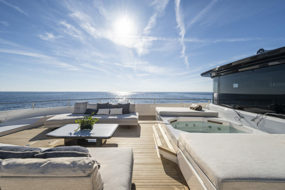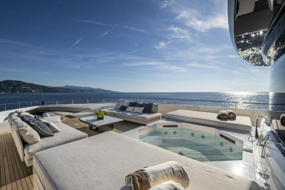 Fully open, it connects both aft and bow areas seamlessly for a one-of-a-kind al-fresco setting. We have a foredeck with lounge chairs and a pool. Further out is the Nest Deck with a suspended netting for people who want to feel like they’re floating in the air.