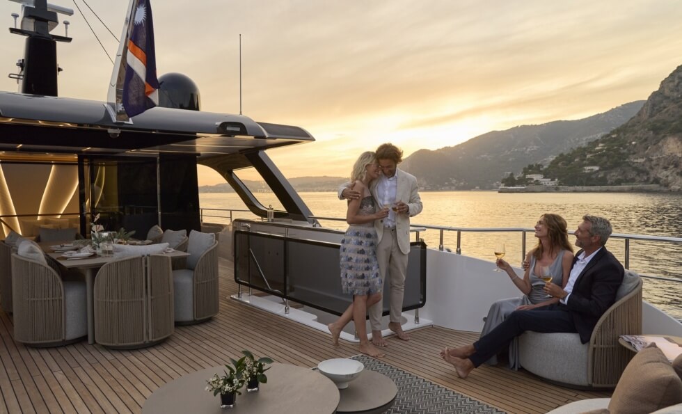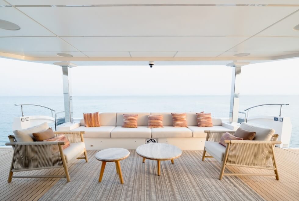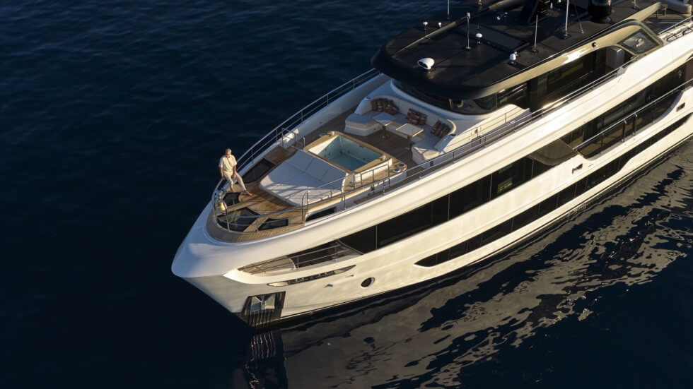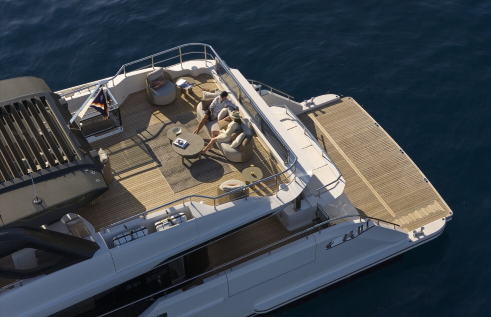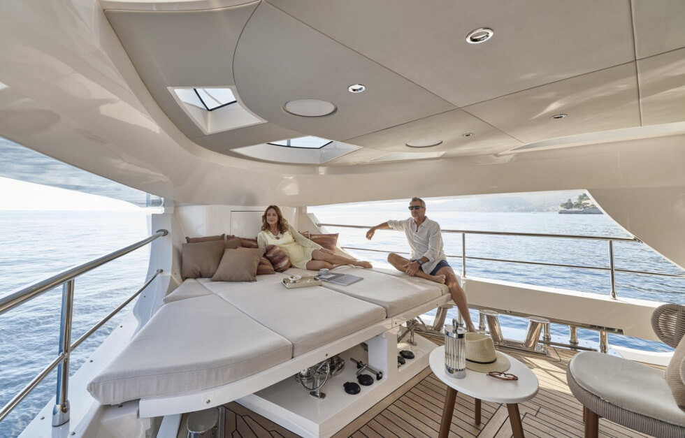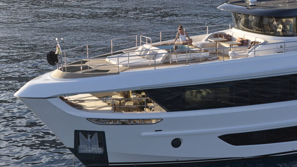 The bow deck provides shelter from the sun, while gentle ocean breezes flow freely via the starboard and port cutouts. As long as the cruising speed is just right and the water conditions are not rough, this is the ideal place to relax. The only way to access this section is via the primary suite on the main deck.