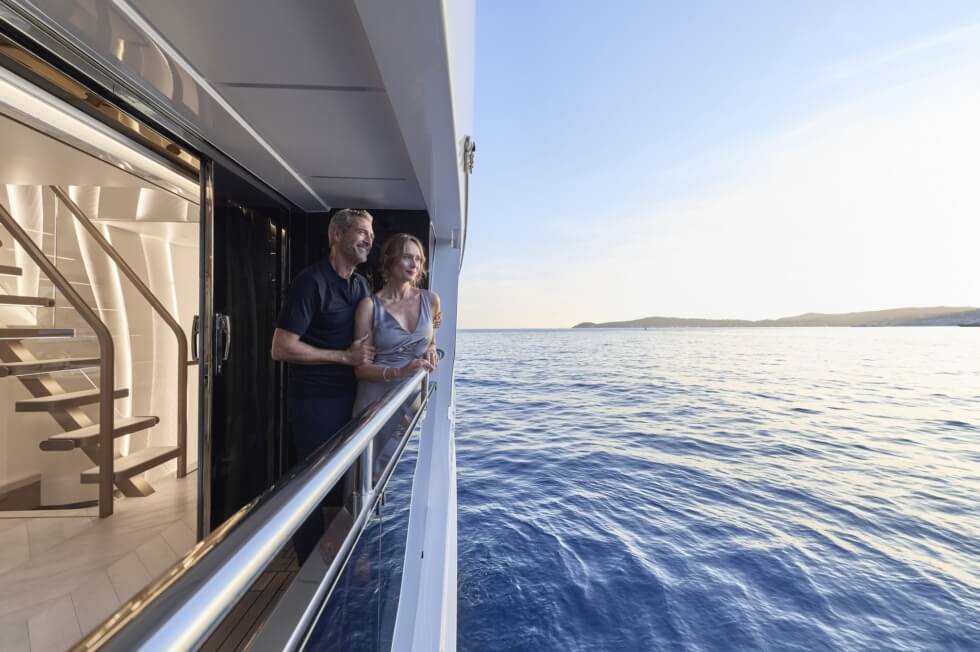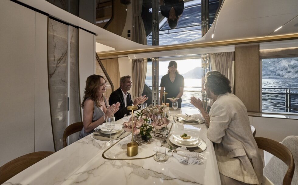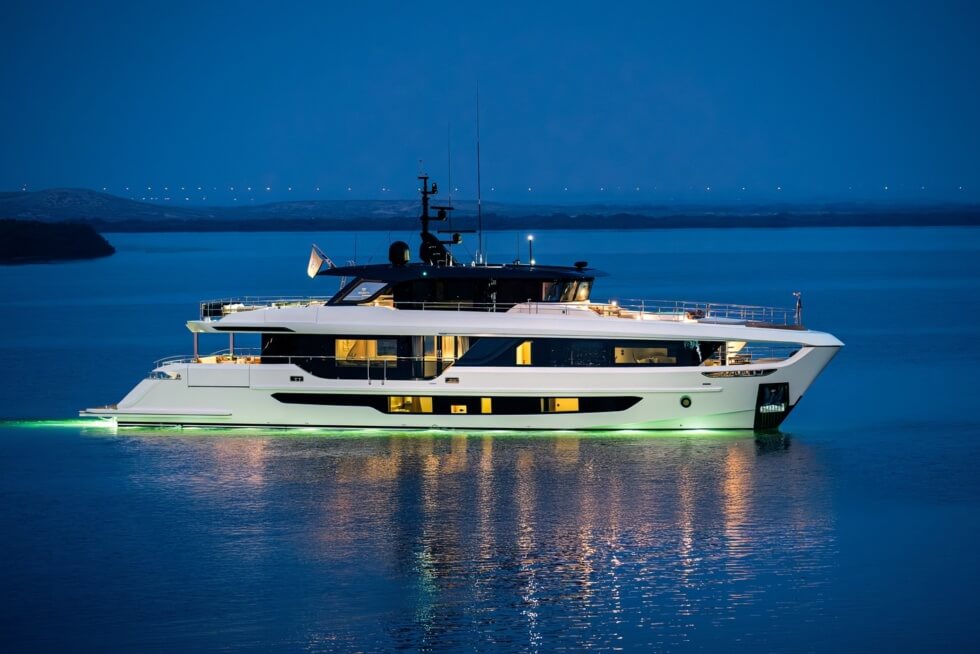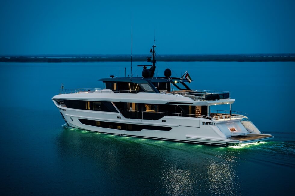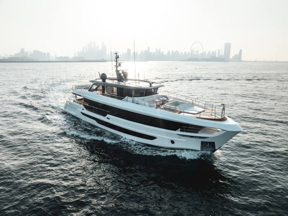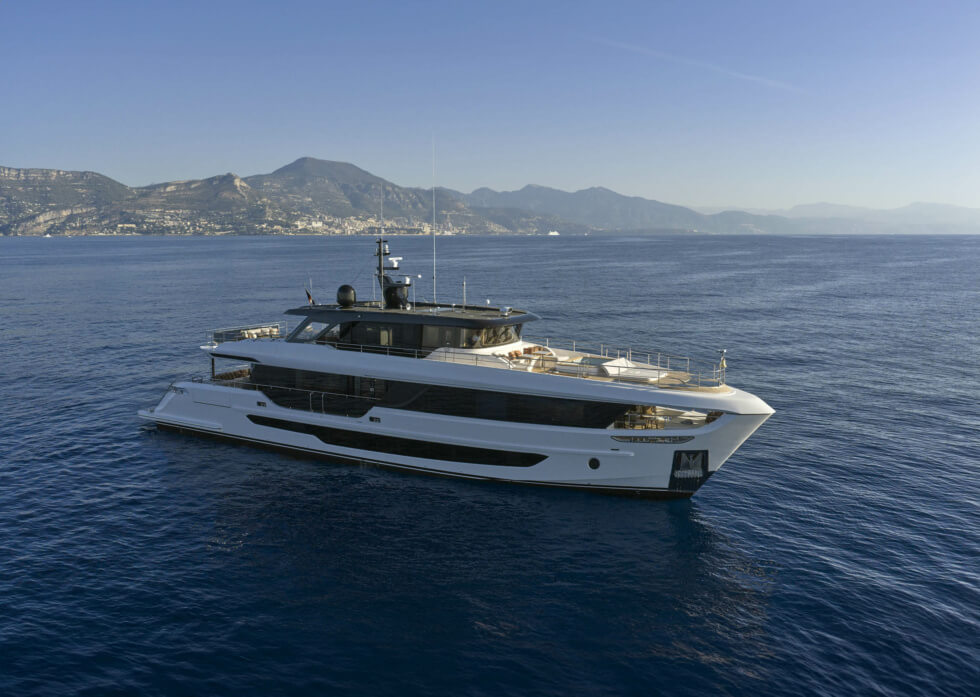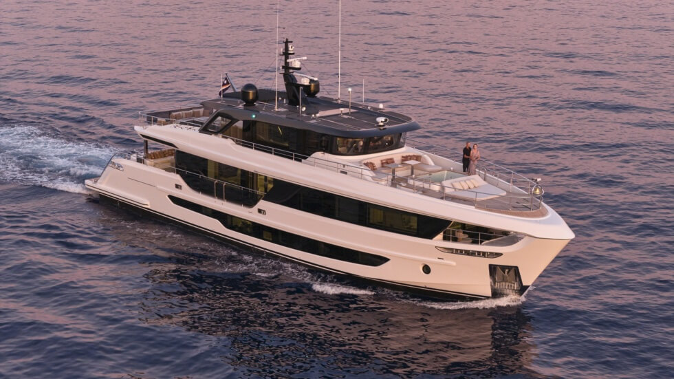 Creative input from Dutch design firm Phathom Studio defines the exterior and interior aesthetics. The overall motif is lavish yet minimalist, with a modern touch. Timber, fabrics, and other materials combine for a cozy atmosphere. The Majesty 100 Terrace also boasts five staterooms in the lower deck. This 100-footer can cruise up to 14 knots and cover 1,366 nautical miles at 10 knots.