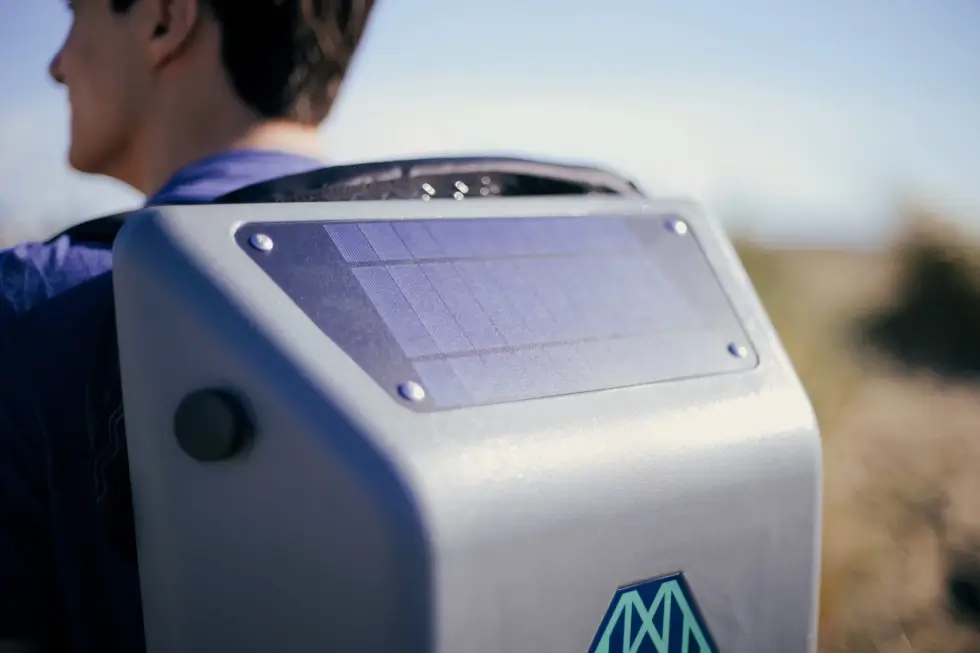 The pack features a durable waterproof shell made of recycled water bottles. It has a 4W polycrystalline solar panel mounted on the top connected to an internal 10,000 mAh rechargeable power bank. A full charge of the battery requires four to six hours of direct sunlight. It can power two to three smartphones in a single charge via a built-in USB port.