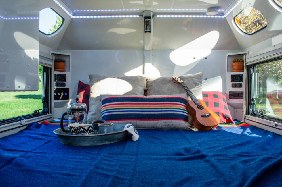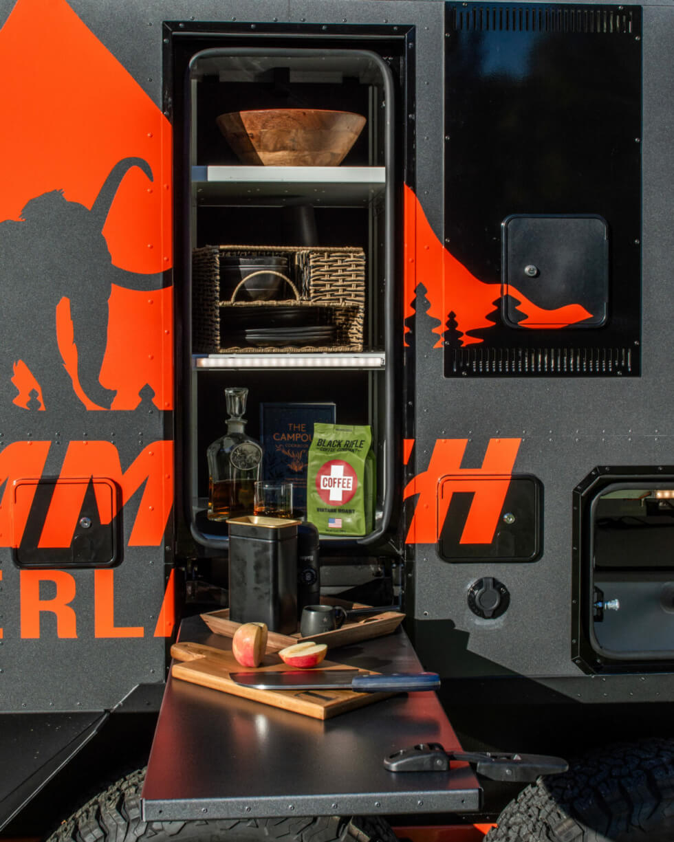 From the outside, Mammoth Overland outfits this tough trailer with steel rock sliders, LED rock lights, an off-road hitch, a mounted ladder, a modular roof rack, Molle exterior racks, two spare tires, three Rotopax containers, a shovel, a hatchet, traction boards, and a bunch more. Since you’ll be spending most of your time inside, here’s what to expect.