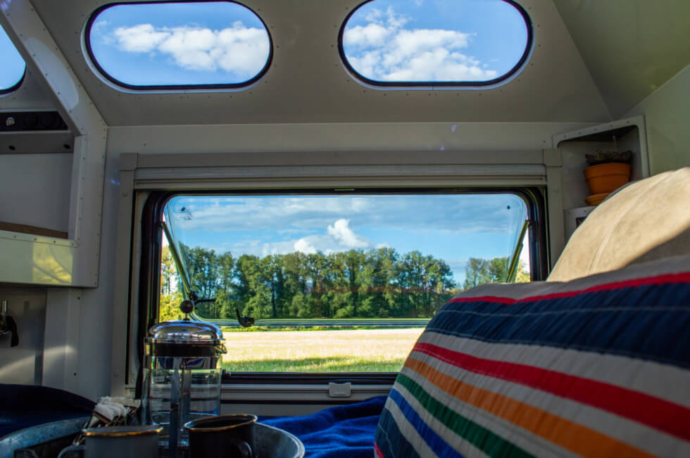 Creature comforts within its living spaces include a king-sized mattress, a modular bunk bed/couch, a pre-installed propane system, multiple tinted porthole windows, a Dickenson heater, emergency exits (large windows), and an indoor/outdoor pass-through pantry. Food preparation should be no problem with its decked-out galley.