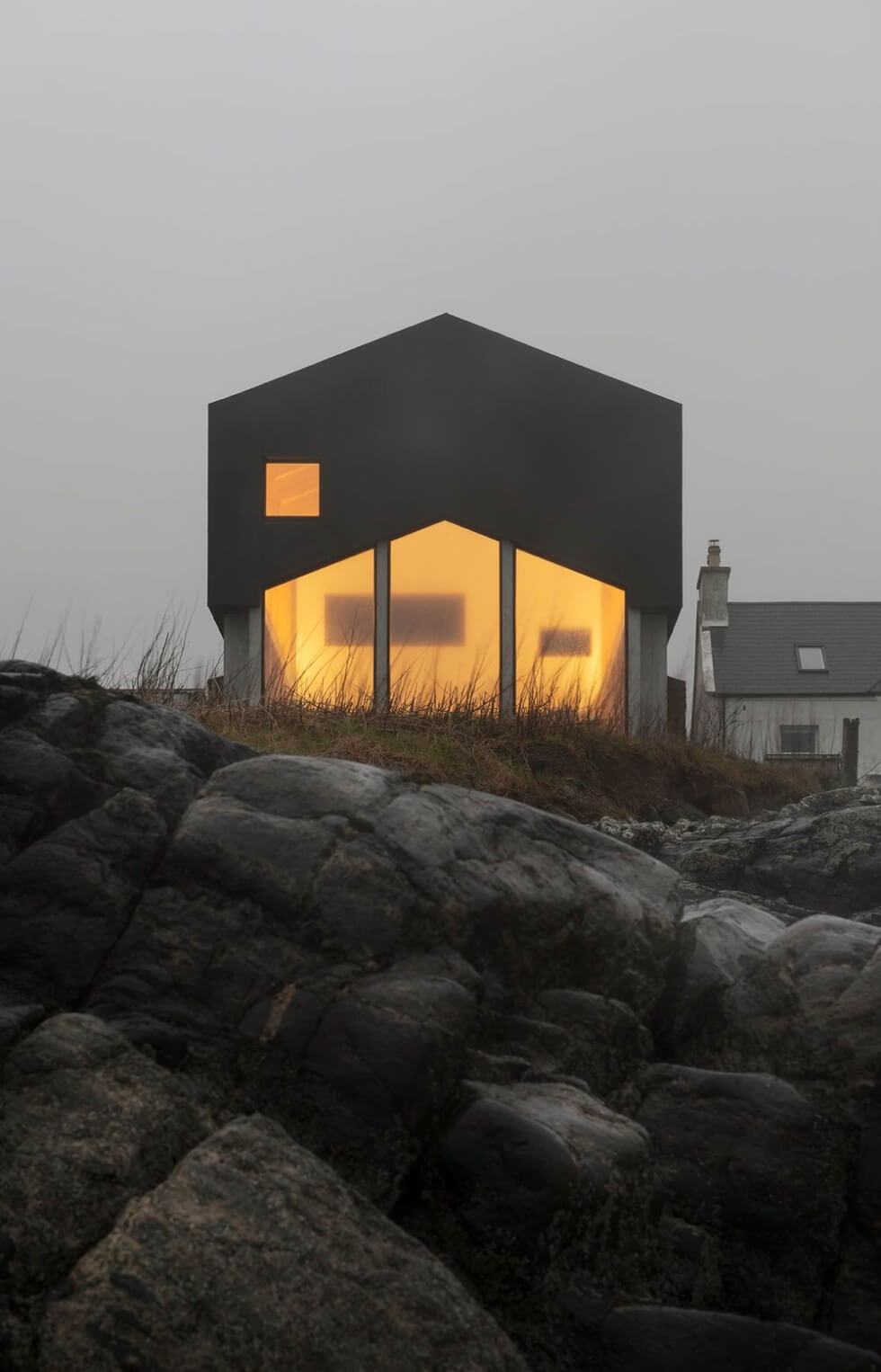 The Mannal House is idyllic for anyone who wishes to wake up to the amazing view of Hebridean Island. It perches atop a rocky coast and looks east towards the mainland over the Isle of Mull. Its construction takes inspiration from its surrounding farm buildings, ruins, and a derelict cowshed, known as a byre. The outcome is a house split into two wings wherein guests enter through the stone gable into a courtyard garden.