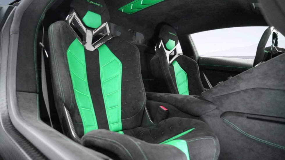 Getting back to business, Mansory is giving this high-performance Italian hypercar a subtle-yet-substantial makeover. From a visual standpoint, we can see that the carbon fiber body kits add 1.575 inches of width to the Cabrera. Moreover, the shop is draping the exterior with a stunning Vento Verde chameleon paint.