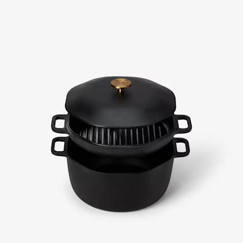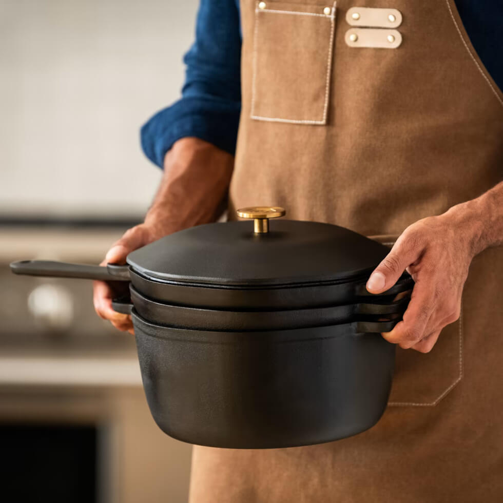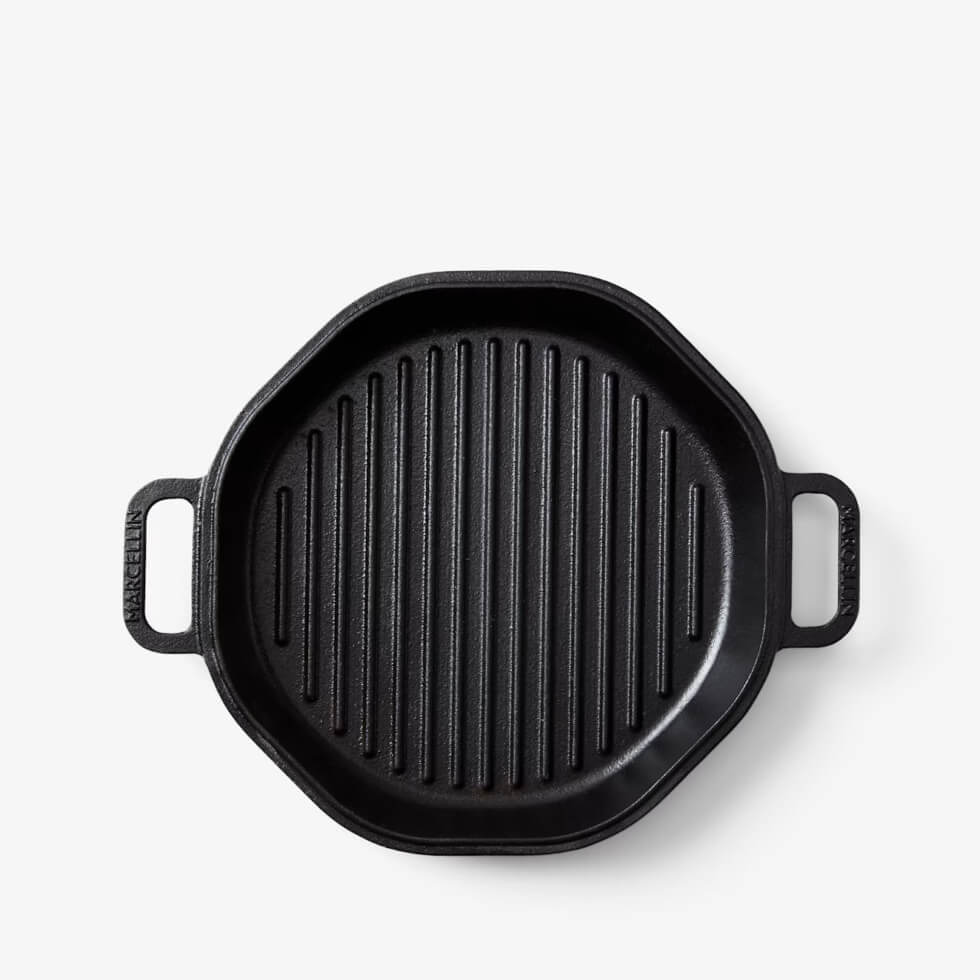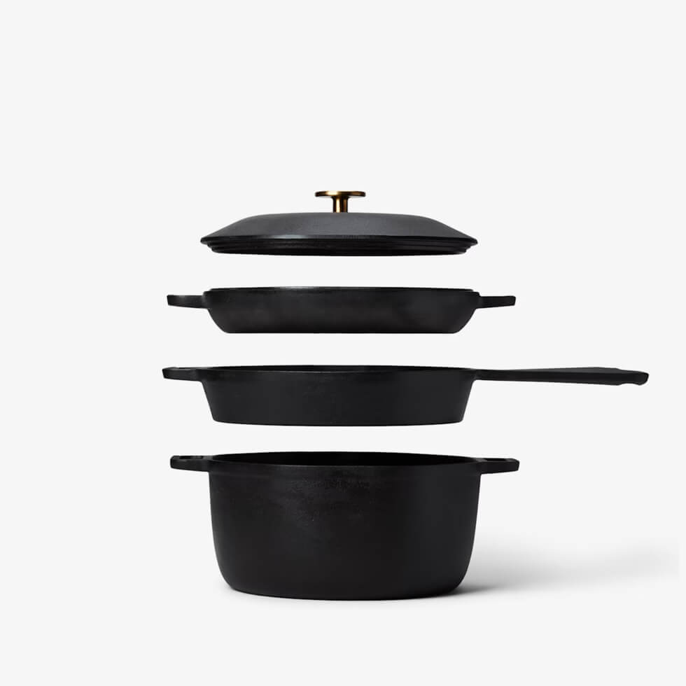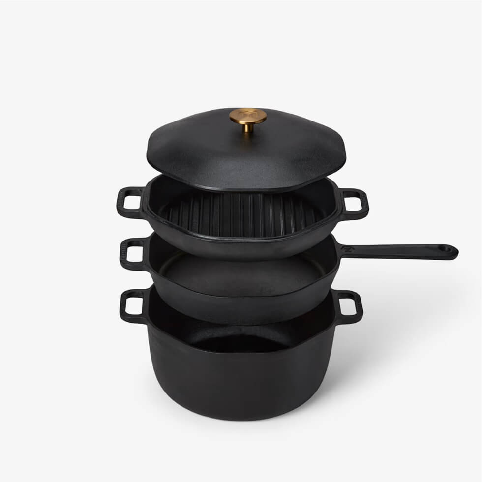 In designing the 4-in-1 Cast Iron Stack, Marcellin opted for the optimal thickness to give each piece a balance of excellent heat retention and even distribution. This way, they remain durable and able to withstand high-heat searing. The result is heirloom-worthy cookware compatible with all heat sources, including open flames, grills, and ovens.