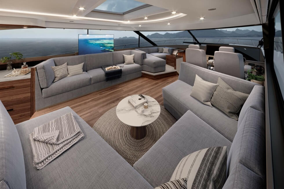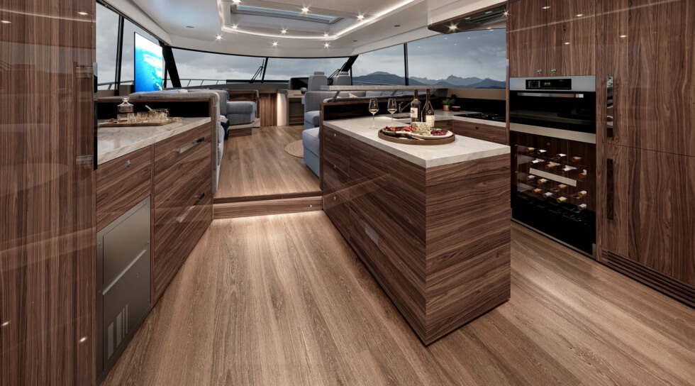 Sliding glass doors create a sense of separation but retain an open-air atmosphere as you enter the covered cockpit. Here you can find a furnished living area with a pop-up 65” TV for entertainment. A galley towards the aft is ideal for food and beverage preparation for people to enjoy al-fresco or indoors.