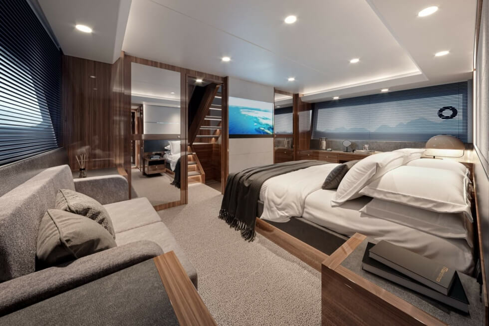 Although more modest in size than other stately vessels, this yacht is not lacking when it comes to the finer things in life. At 75 feet, there’s plenty of space for owners to kit out according to their opulent tastes. The shipyard describes her as sporty with “sleek Portofino hips” and a profile that conveys agility over water.