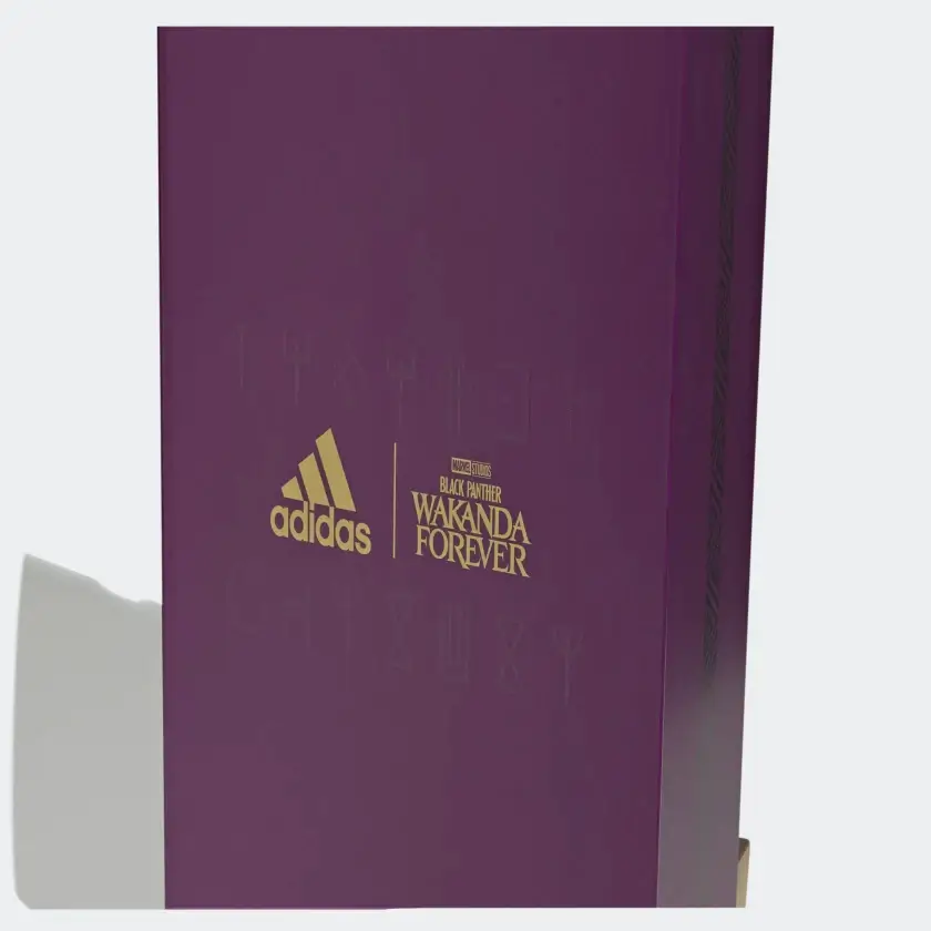 This mimics the weave-like pattern of his Vibranium armor. Meanwhile, the toe box shows four spikes to mimic the collar spikes of the Black Panther suit. The lace cages feature more weave patterns and as well as gold for the iconic Three Stripes.