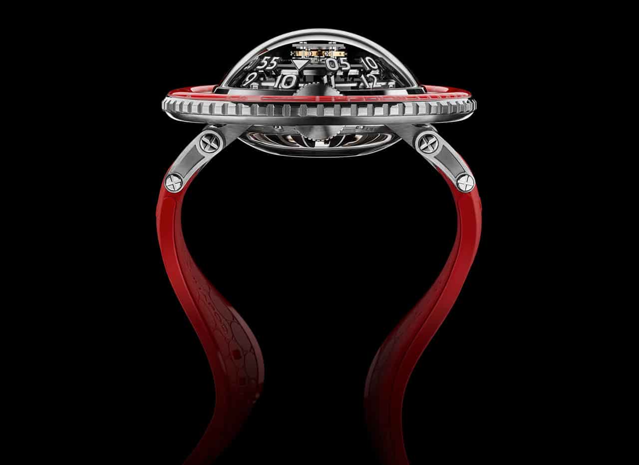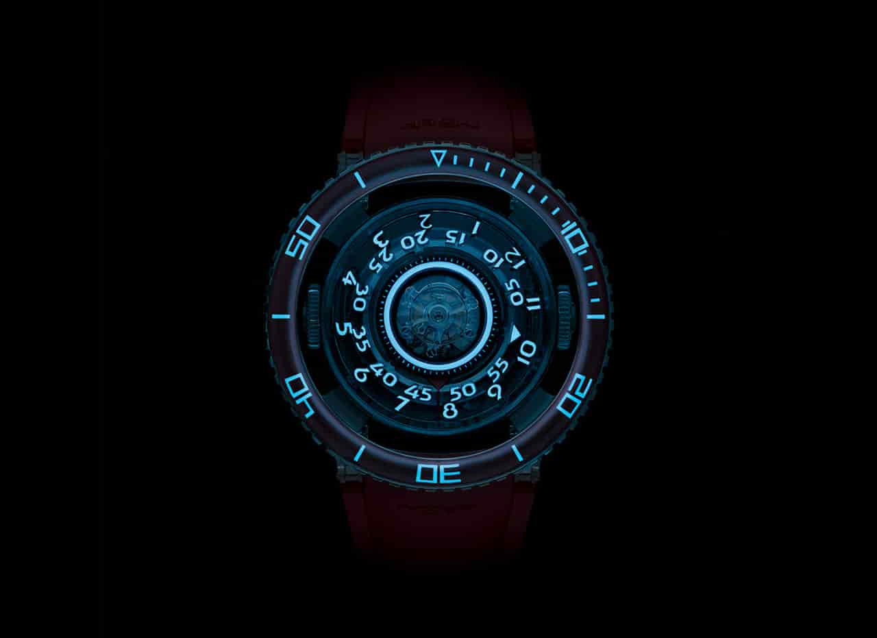 Unlike traditional watch complication that features rotating hands, the HM7 Aquapod uses a floating indicator on the 6 o’clock position instead. Meanwhile, the hours and minutes ride on two coaxial titanium discs that spin around as well. Furthermore, the Super-Luminova coating makes all of the details visible in low-light conditions.