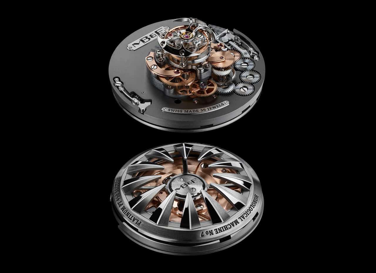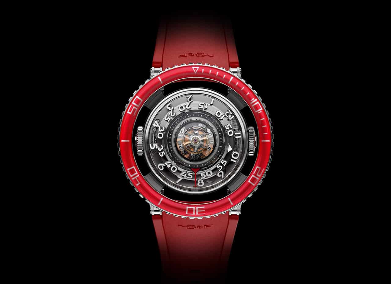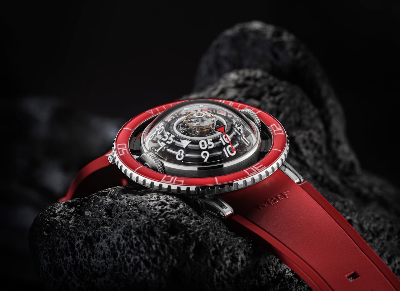 MB&F reveals that the inspiration for its exceptional design comes from the humble jellyfish. A 60-second flying tourbillon with a sapphire crystal brides sits dead center on the dial. The unique placement of its indices emulates the ripples that extend outward from the middle.