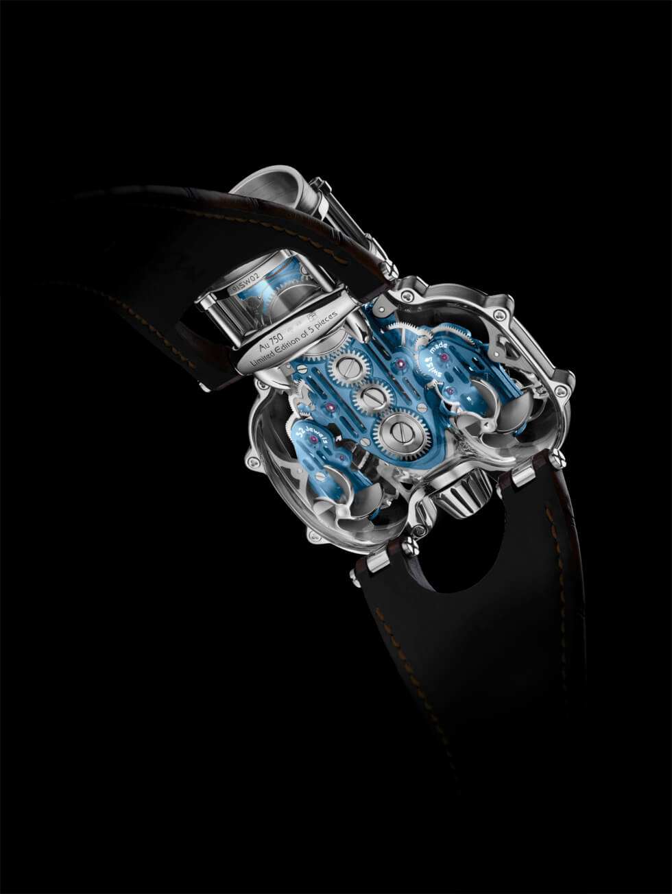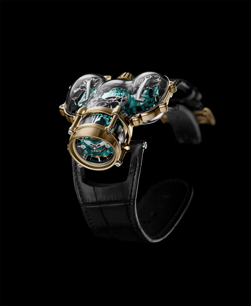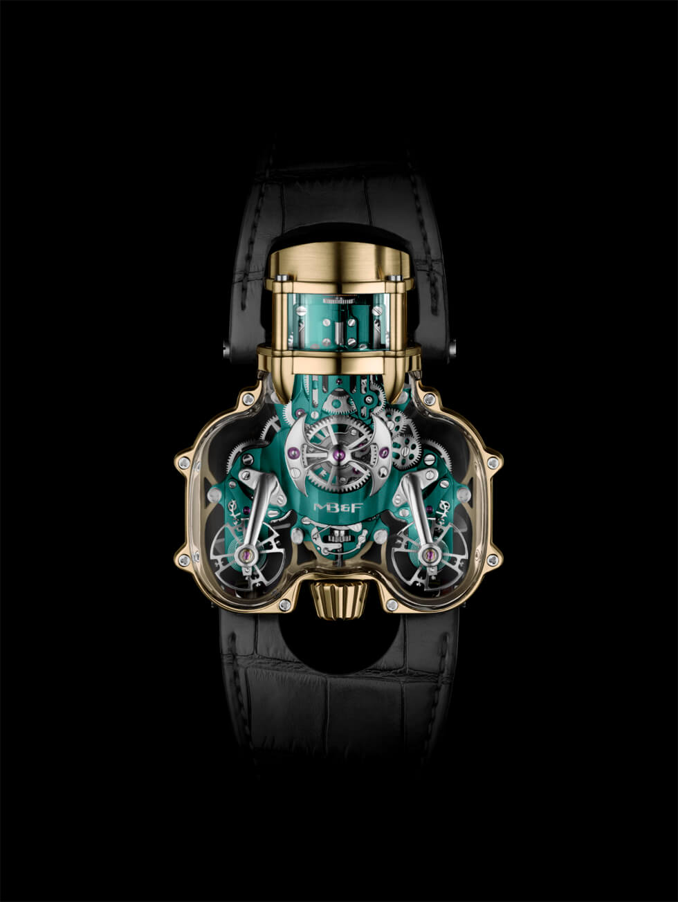 Its layout positions the crown at the lateral edge, while the medial section hosts an aperture for the dial. Depending on the variant, your HM9 Sapphire Vision will come with a blue (white gold) or green (yellow gold) dial. Finally, MB&F pairs it with a hand-stitched alligator strap in brown or black, respectively. Only five examples per version are available to purchase.
