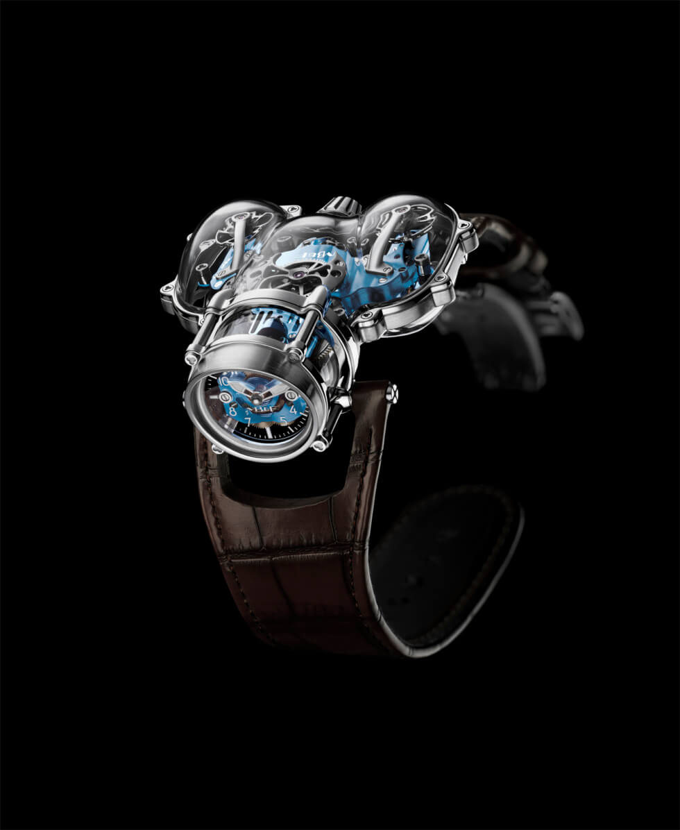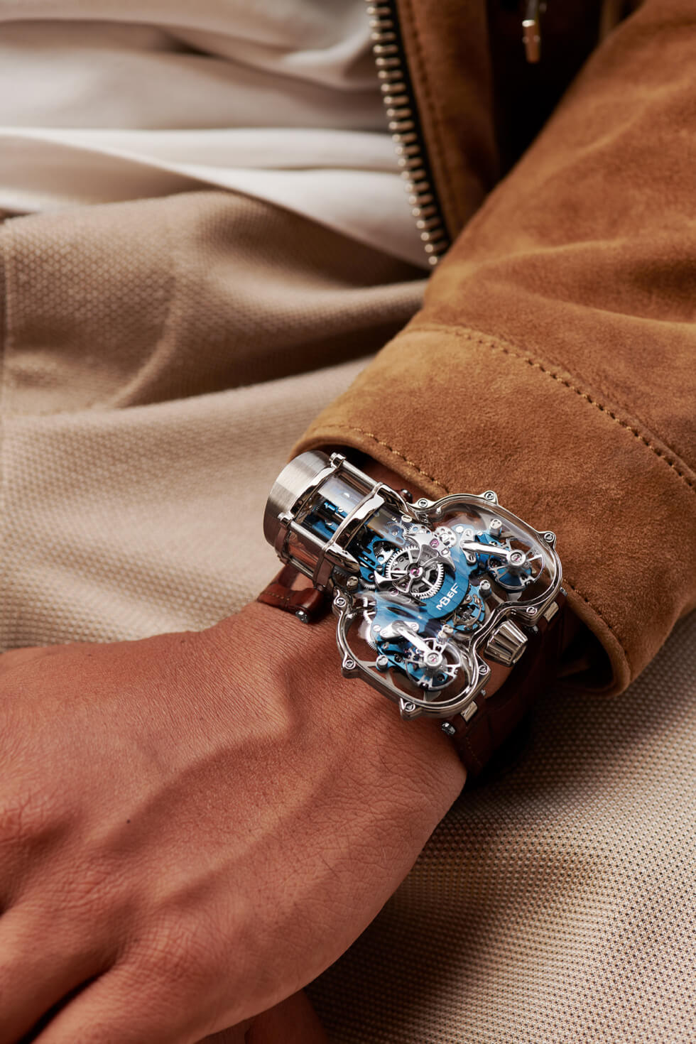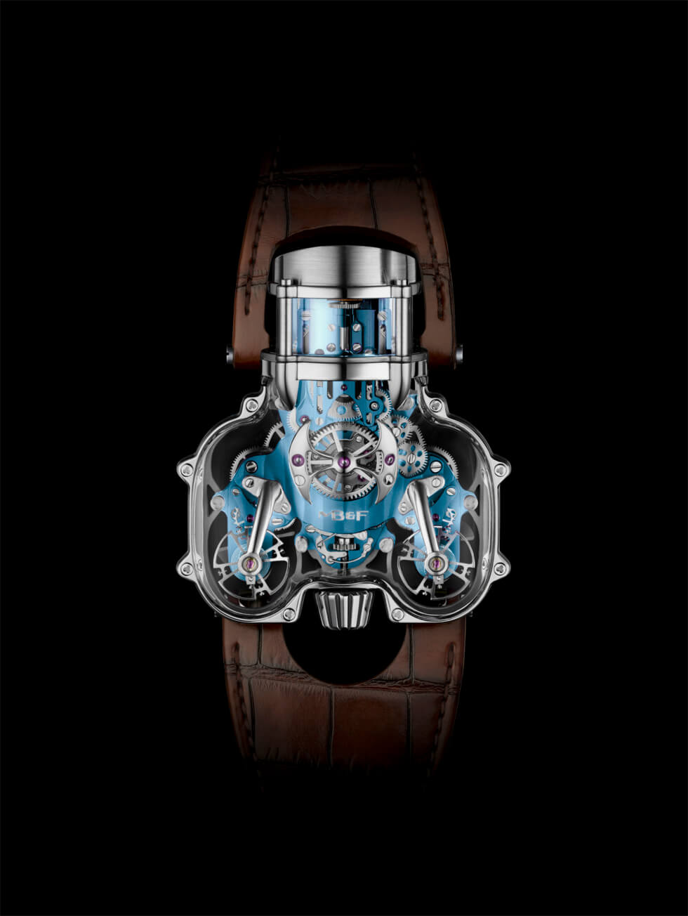 Its layout positions the crown at the lateral edge, while the medial section hosts an aperture for the dial. Depending on the variant, your HM9 Sapphire Vision will come with a blue (white gold) or green (yellow gold) dial. Finally, MB&F pairs it with a hand-stitched alligator strap in brown or black, respectively. Only five examples per version are available to purchase.