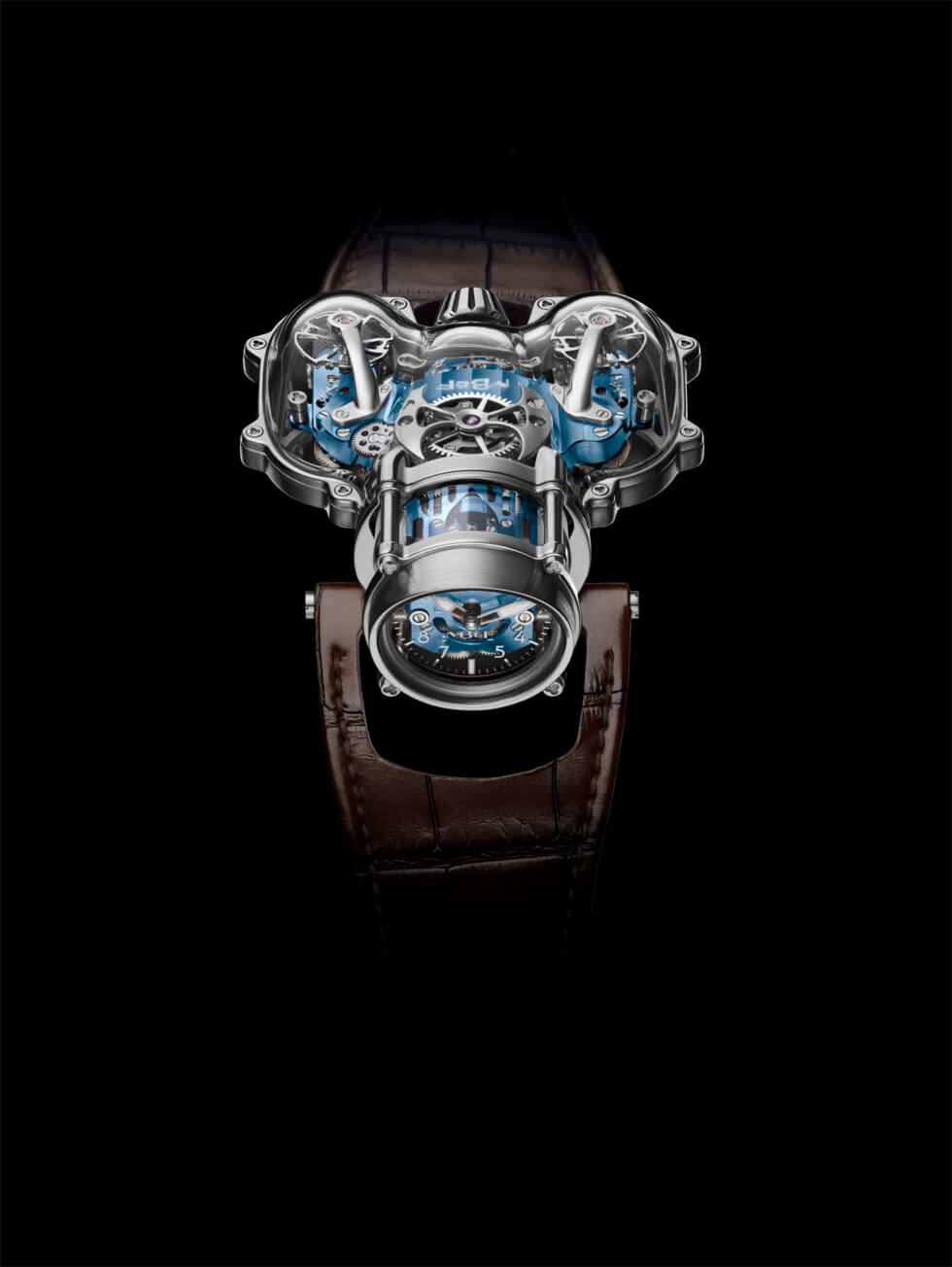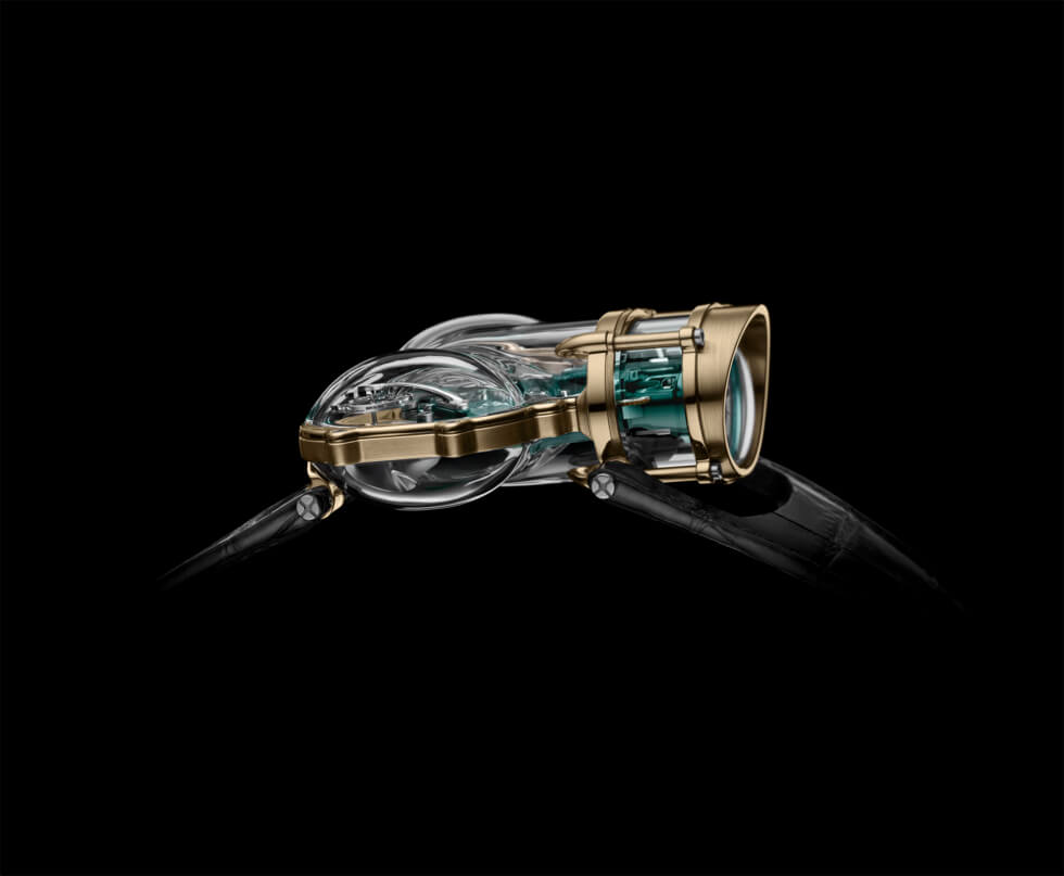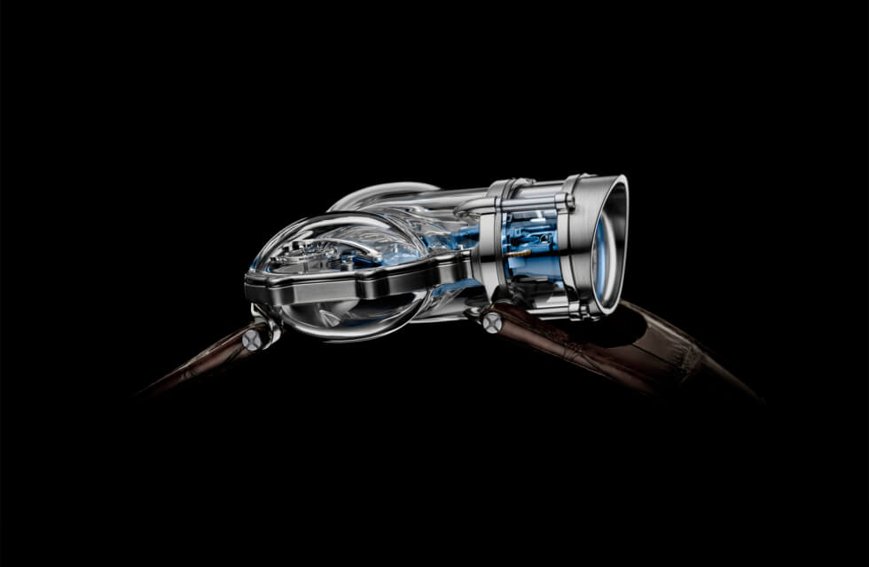 The HM9 Sapphire Vision is by no means modest when it comes to dimensions. Moreover, its outline is anything but conventional. MB&F meticulously fabricates a housing out of sapphire and precious metals – particularly white or yellow gold. Let’s be honest, its appeal is unique given the somewhat phallic form factor when viewed from certain angles.