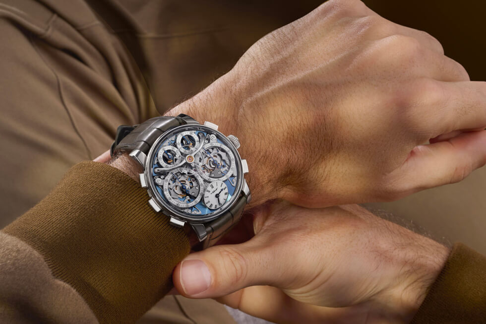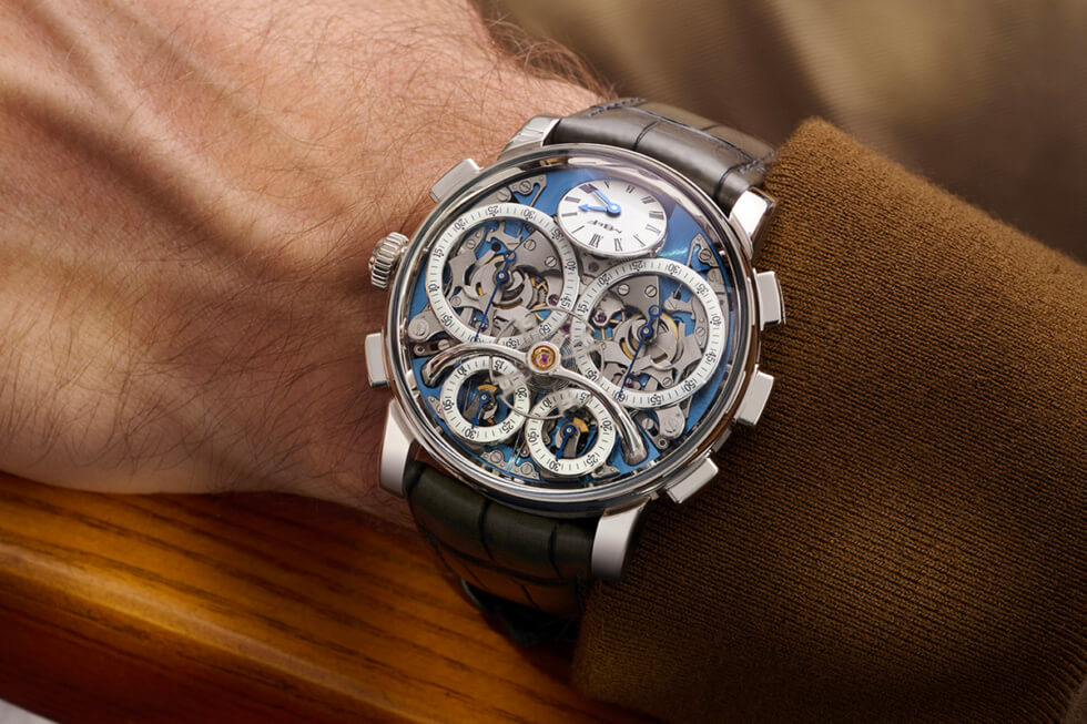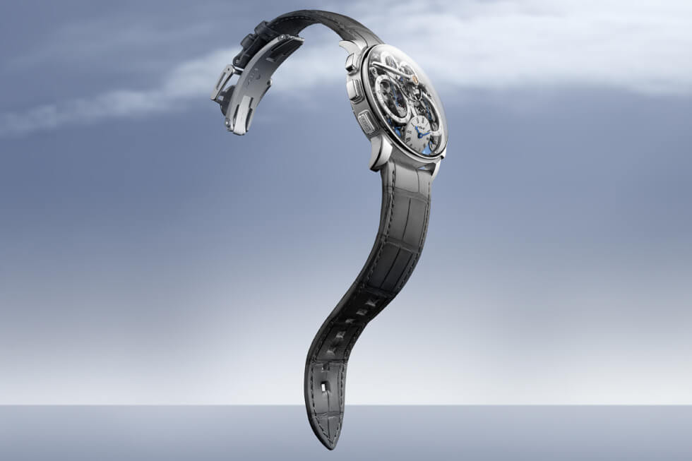 Corresponding pushers are also found on each side of the LM Sequential Flyback Platinum’s case middle. Keeping everything in motion is an in-house hand-wound movement. The manual caliber features 619 components with 63 jewels and a 72-hour power reserve. The indicator for the latter can be viewed on the exhibition case back.