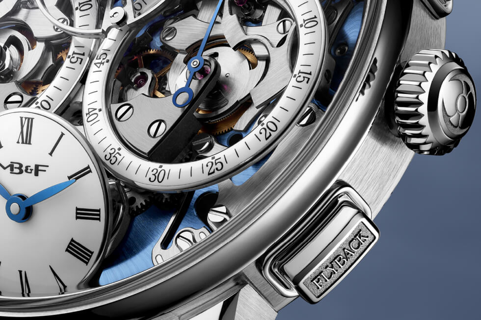 From every angle, it’s evident MB&F designed a timepiece with exceptional attention to detail. At a glance, the LM Sequential Flyback Platinum seems to show a typical open-worked dial, but the arrangement of its timekeeping elements was carefully curated for the user’s convenience.