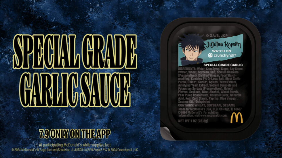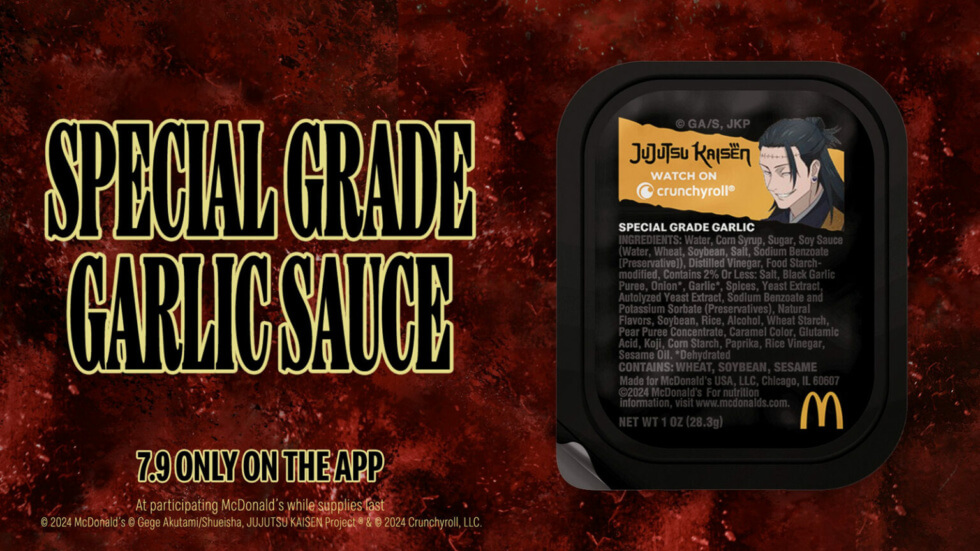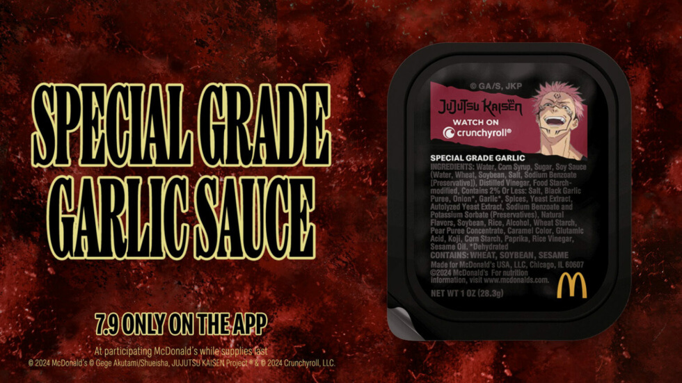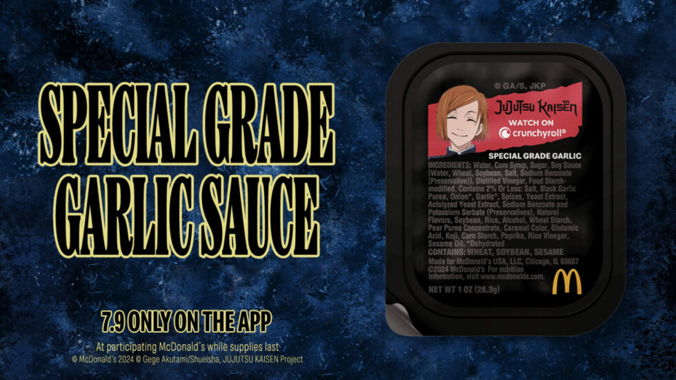 McDonald’s teamed up with the 2024 anime of the year, “Jujutsu Kaisen,” to release an American twist on the celebrated Black Garlic Sauce from McDonald’s Japan. The new sauce is tangy and sweet with notes of garlic and soy sauce, and comes with exclusive package designs featuring characters from the manga.