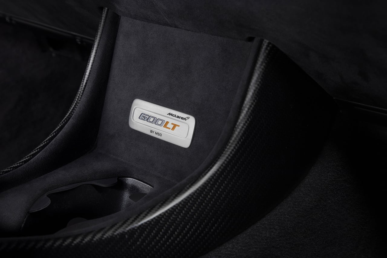Inside, there’s more carbon fiber on the door inserts and sides of the center tunnel. There’s also a nice little touch here: a 600LT emblem on the accelerator pedal.