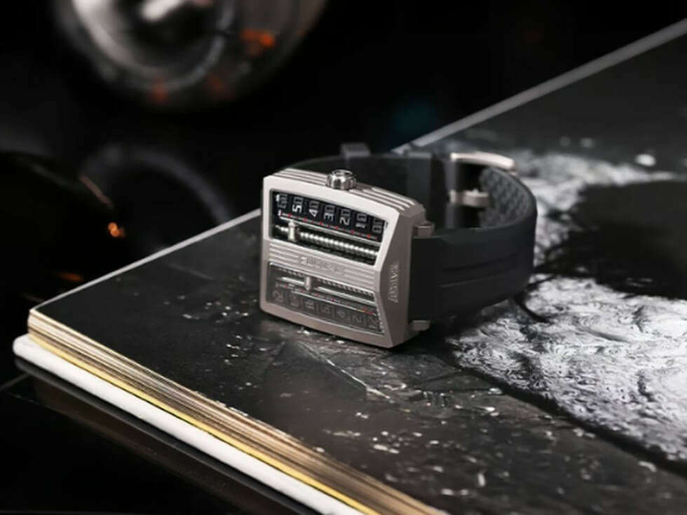 Each display window features a rotating screw with an indicator. The left side tells the hours and minutes, while the right shows the minutes and seconds. Similar to a retrograde complication, the pointer returns to the bottom once it reaches the top. Elsewhere, the MS1001-Ti runs on a CNC motor drive movement.