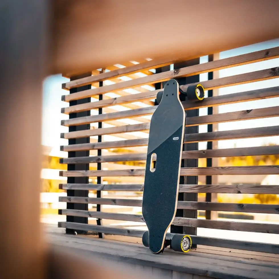 It measures approximately 968 mm x 240 mm and is remarkably solid with just the right amount of flex. A small cutout makes it easy to carry when not in use. Likewise, the grip tape keeps your shoes firmly in place, while the heavy-duty trucks and wheels are notably responsive.