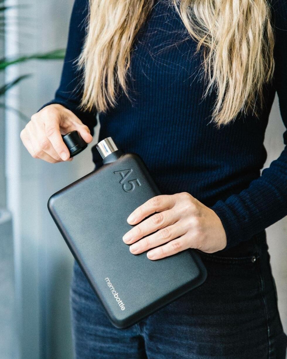 The Memobottle comes in four sizes: 33 oz, 16, 8, and 20 oz otherwise called the A5, A6, A7, and Slim, respectively. For clutches and back pockets, the A7 is the ultimate choice. Meanwhile. the A5 and A6 fit inside backpacks, laptop bags, handbags, messenger bags, and more. The Slim size, on the other hand, is for deep bags, totes, and dedicated bottle pockets. Either size comes in a matte black or matte white color.
