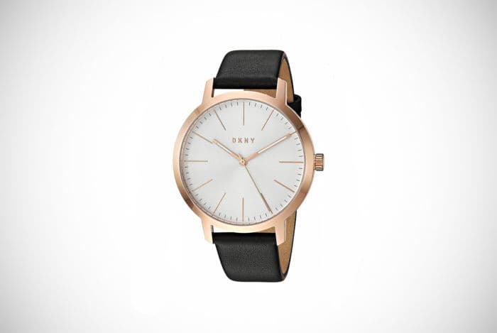 Perhaps you like the leather strap in the model above but want something a little brighter. Take a closer look at this beautiful Donna Karan New York dress watch. Titled The Modernist, this has a very appealing, bright clock face with a rose gold stainless-steel casing and black leather strap.