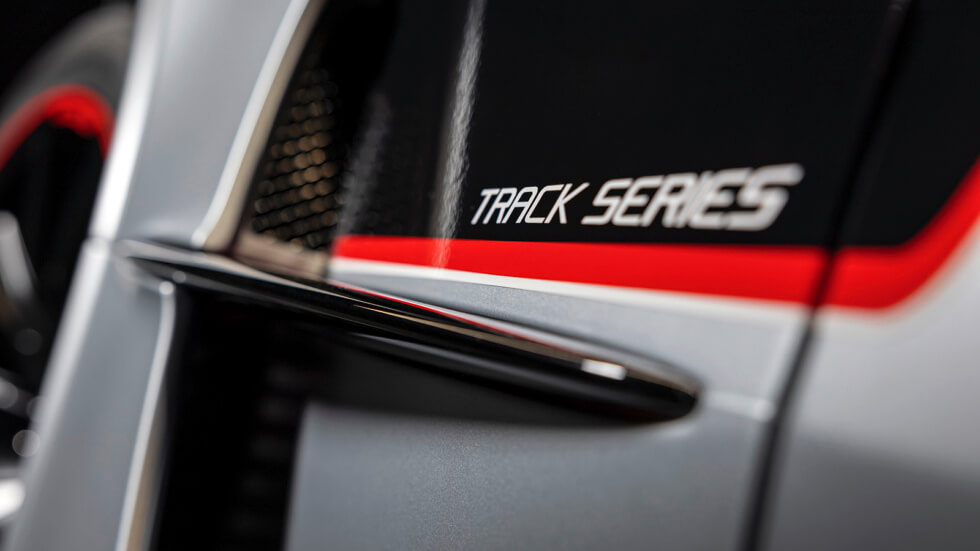 Inside the cockpit, you’ll find a single composite seat, a five-point harness, a roll cage, safety nets, escape hatch, fire suppression systems, and a custom racing wheel. Thankfully, they’re not stripping out the air conditioning. Still, GT Track Series owners can opt for the ventilated seat and helmet with a drink system.