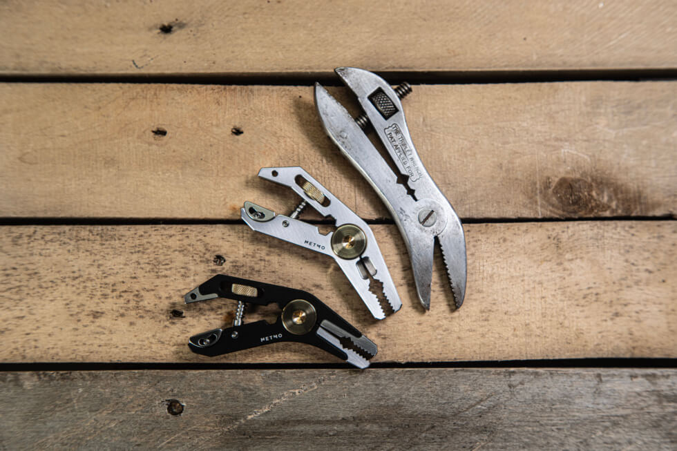 MetMo describes the Pocket Grip as “a whole new kind of tool not seen since 1915. This pocket machine, wrenches, pinches, clamps down and holds fast, harnessing the power of a vice in a lightweight pocket tool.”