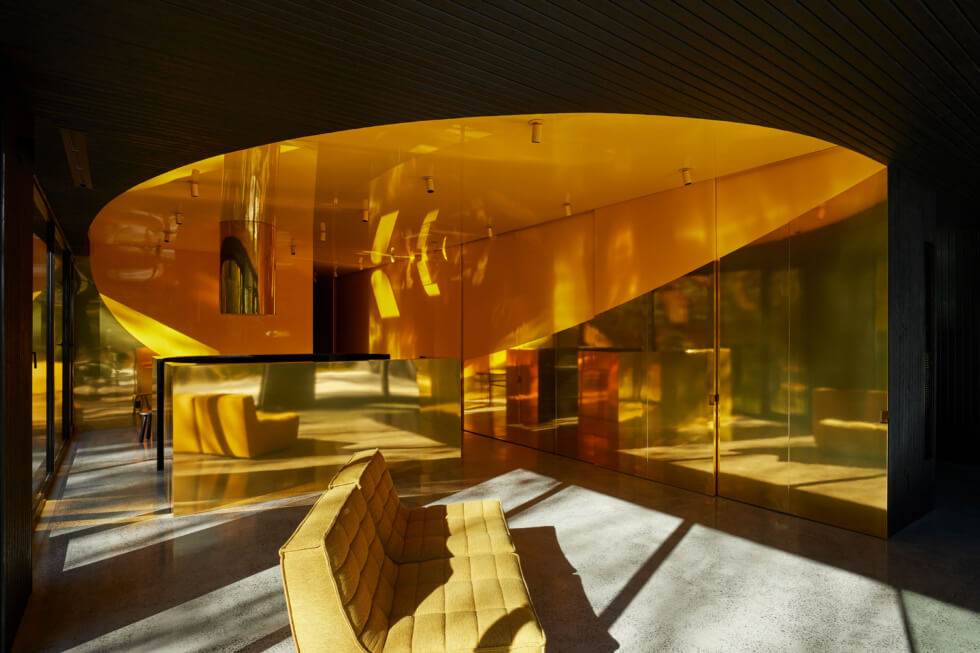 Next, the southern section of the dwelling is where you’ll find the living room, kitchen, dining room, office, and bedroom. As for the décor, the interiors form a stark contrast with its reflective surfaces, vibrant shades, and intricate patterns, over the dark façade of the MEV Cabin. Overall, it is certainly one of the more interesting architectural projects we’ve seen so far.