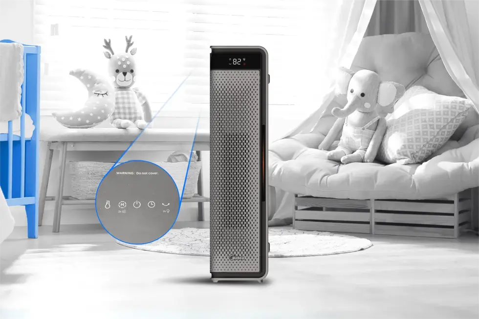 Midea’s Dual-Flex Safe Space Heater warms up fast with three heat levels available, including ECO Mode and Fan Mode for optimal comfort. Its user-friendly intuitive  interface offers easy monitoring of the settings and temperature adjustments between 41°F and 95°F and monitor settings.