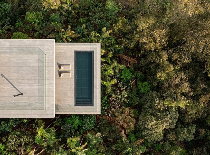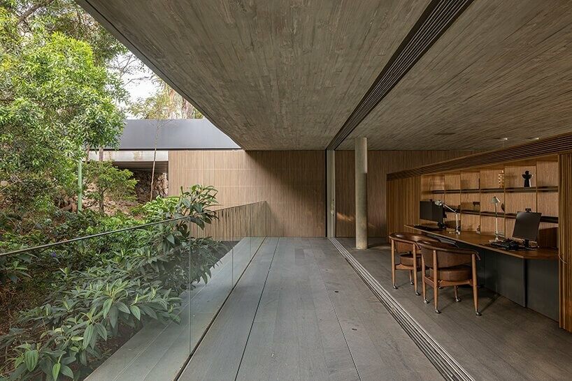 These lift the Minas House’s main floor by up to 32 feet to keep it level given the sloping terrain. Tree trunks from the garden below provide excellent camouflage to make some sections appear cantilevered instead. According to Studio MK24, “suspending the house on stilts allows for rainwater to drain and for the house to breathe.”