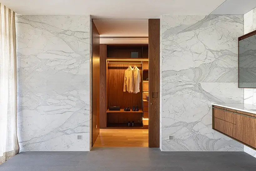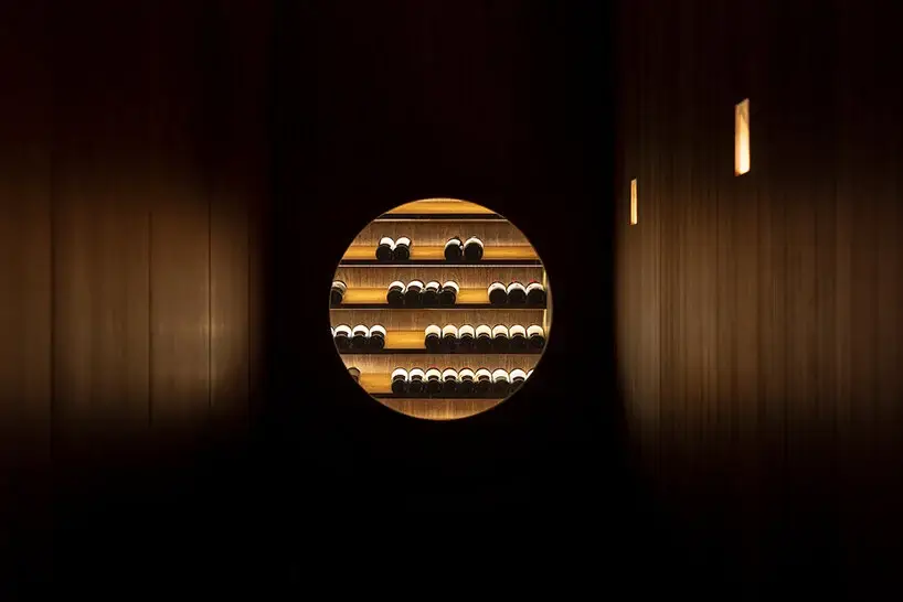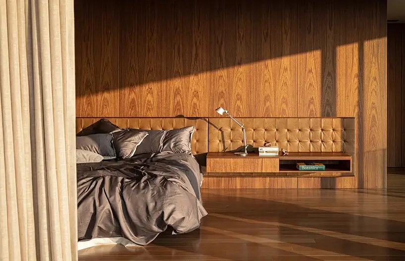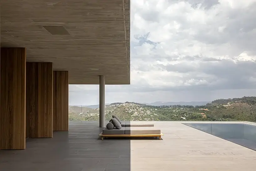 This huge social space includes a living room with a suspended fireplace, a dining area, terraces, and a swimming pool. Sliding panels allow fresh air to circulate freely around the Minas House. Studio MK27 uses bare concrete, basalt stone floors, and wood to create a cozy inviting atmosphere. Take the stairs one more level below to find a winery and a TV room.