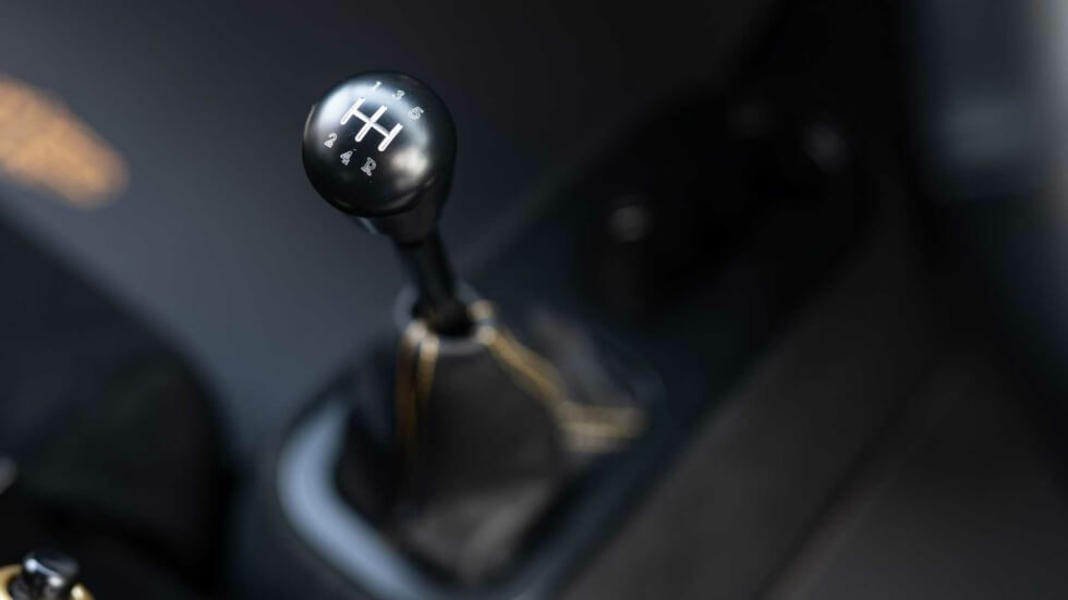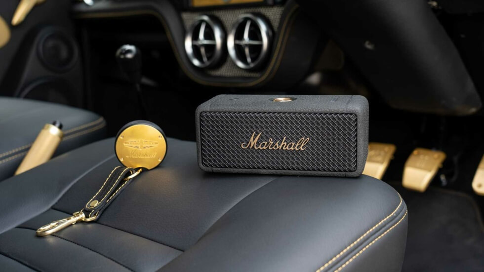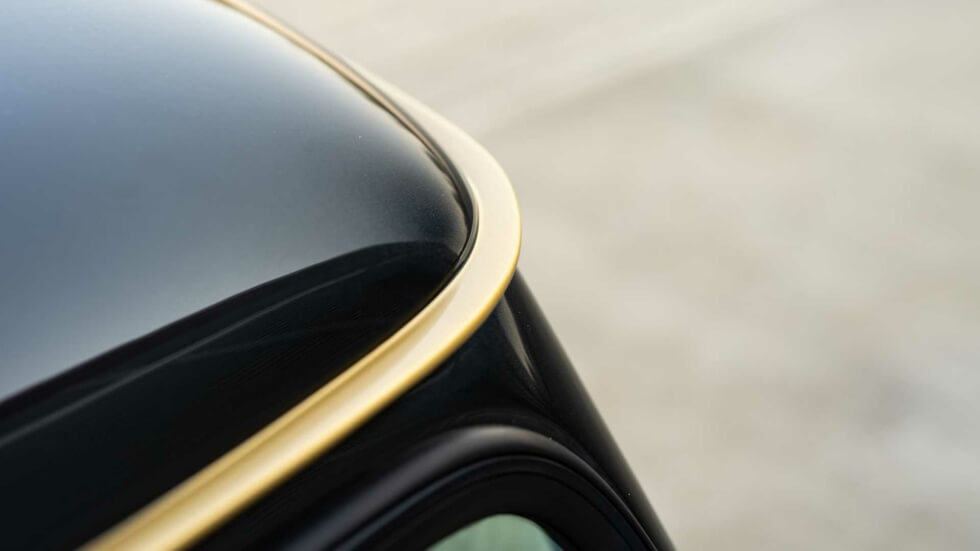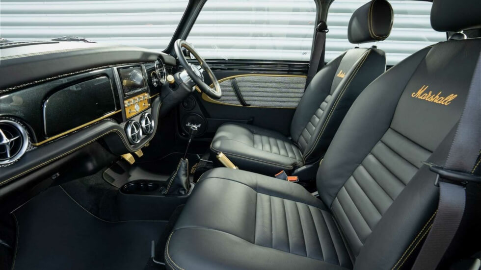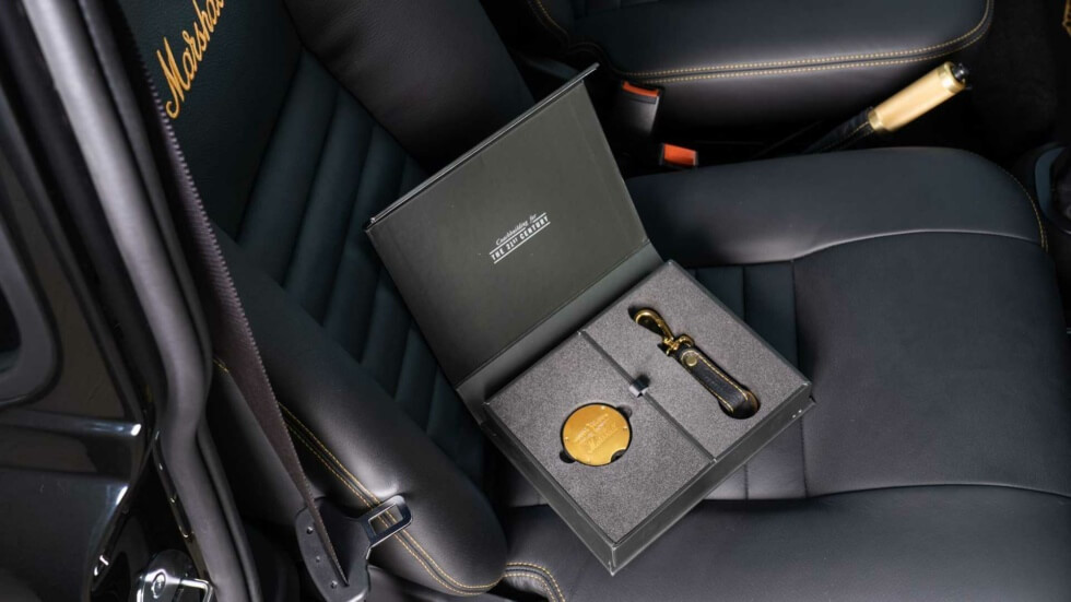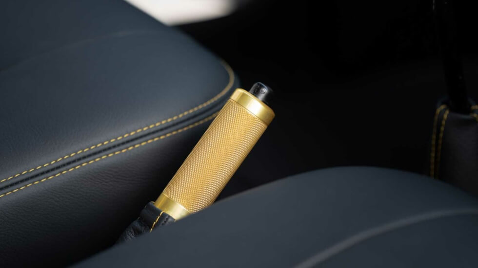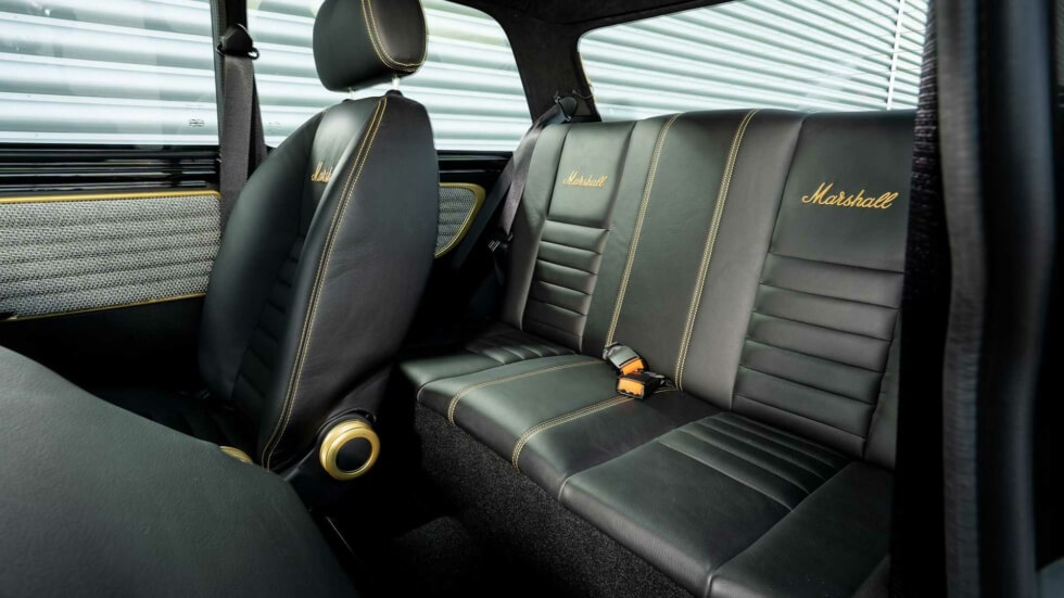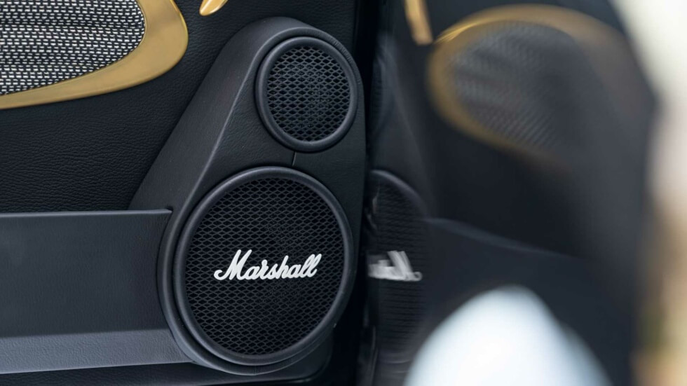Meanwhile, the mesh grille, rims, brake calipers, and Marshall scripts are in gold. The two-tone theme continues inside the cockpit. The black leather upholstery features gold stitching. The metallic yellow trim is also visible on the pedals, handbrake, window rollers, door panels, knurled control knobs.