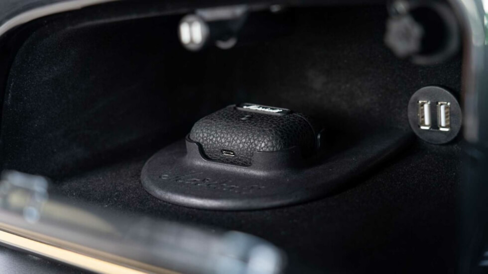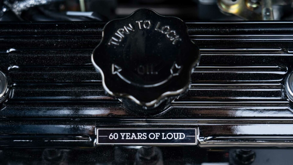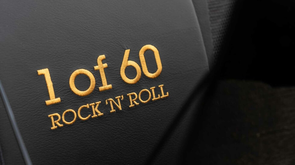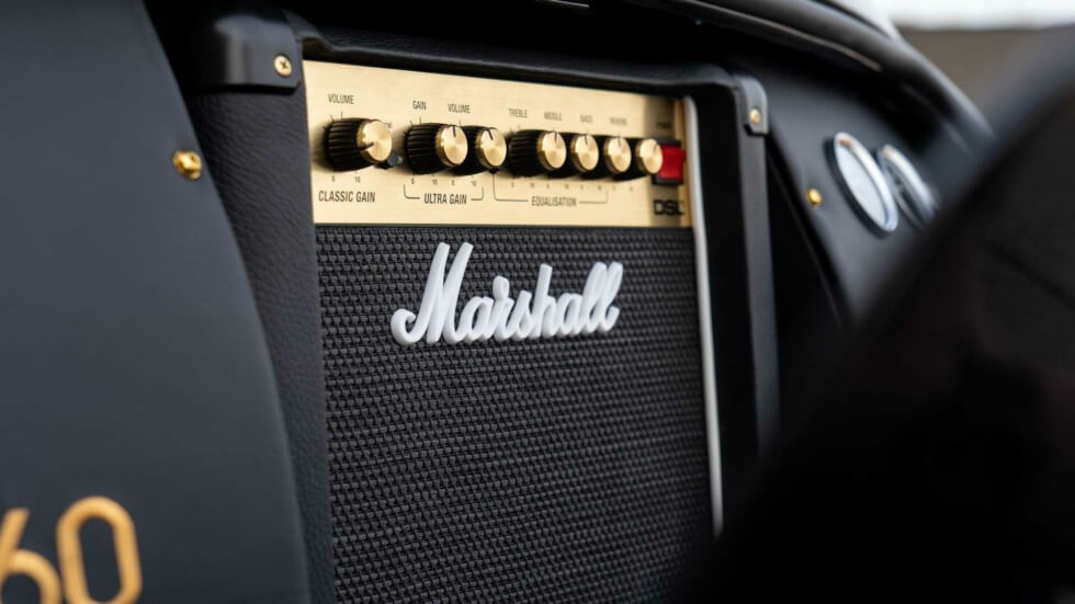 David Brown Automotive even adds a nice touch to the pedals with engravings of the “skip track,” “stop,” and “play” symbols. Open the trunk of the Mini Remastered Marshall Edition to see a slide-out full-size Marshall guitar amp.