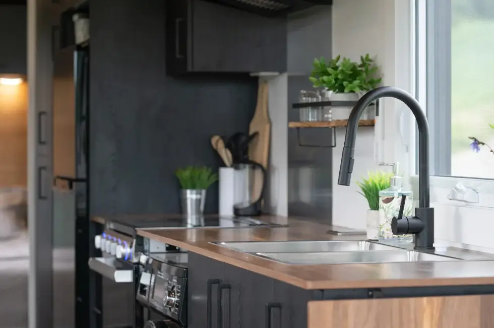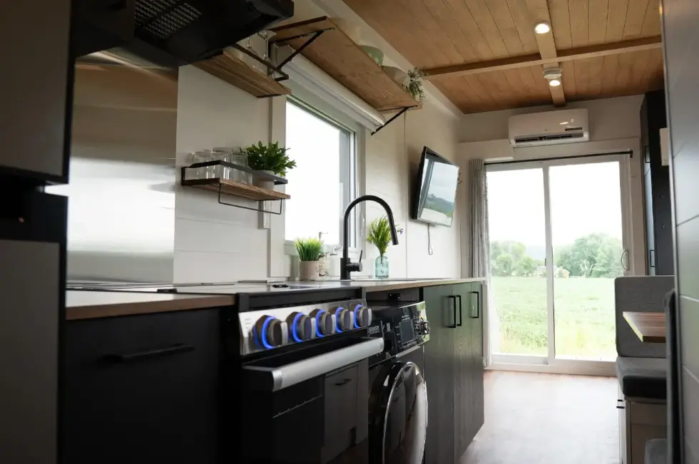 Nomad 30 is equipped with a propane furnace and water heater, a 9000btu mini split AC installed above the entrance door, and the table and countertop are in wood laminate to match the home’s wood accents. Meanwhile, the kitchen has quality appliances including a Furrion 12V refrigerator, Furrion propane range/oven, a 2-in-1 washer and dryer combo, and a microwave oven.