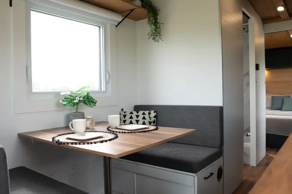 It features a full living area equipped with a sofa bed and several storage spaces, cabinets, and hooks incorporated all throughout the home including in corners and walls. The entrance even has a closet while the living space has a four-seater dinette that turns into a bed that can accommodate two children or one adult.