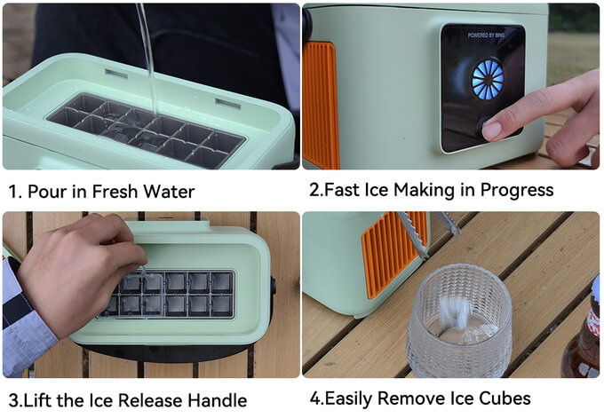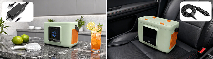 Its heavy-duty, ergonomic handle makes transport easy, whether it’s to the garden, the porch, or out to an outdoor adventure. This ice maker supports AC (110-240V) and DC (12V/24V) power, making it a reliable outdoor companion.