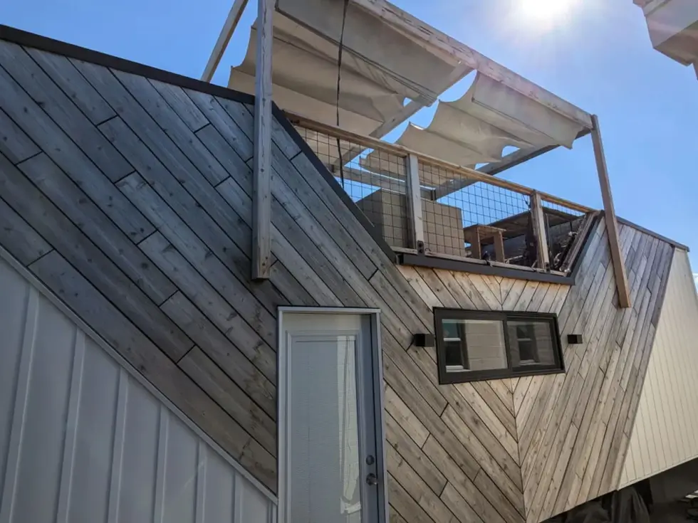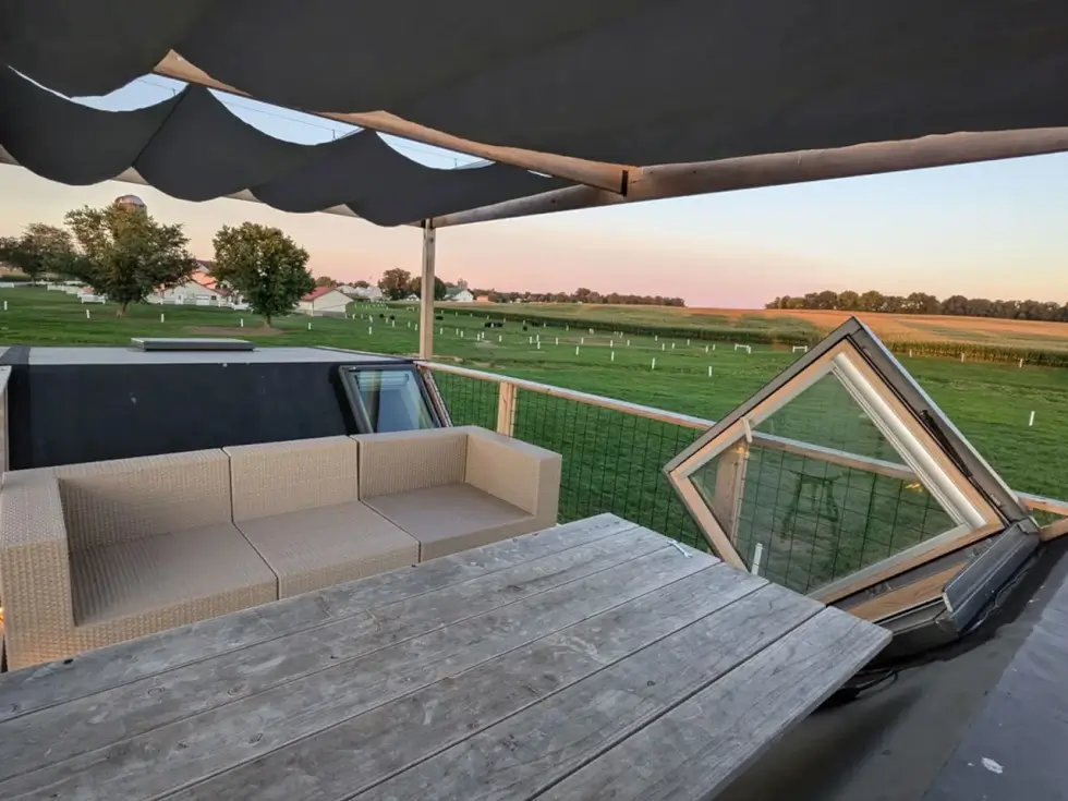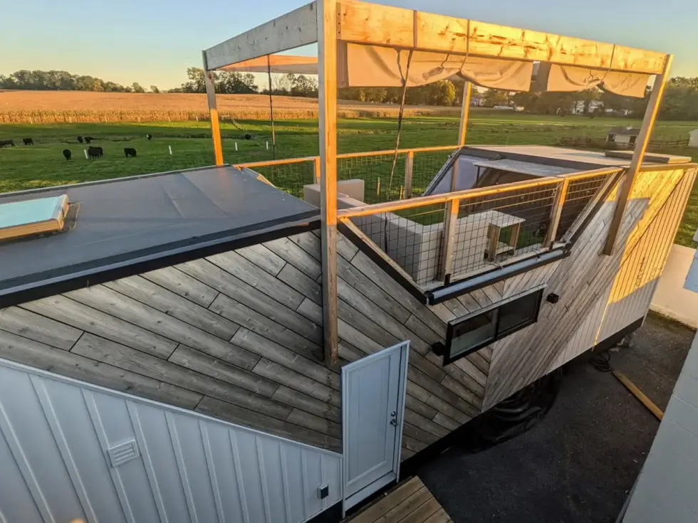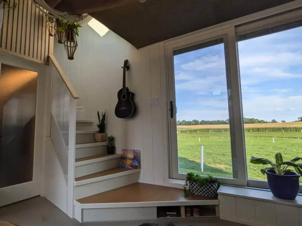 But what makes this tiny house from Modern Shed a standout is the rooftop terrace accessible from the kitchen via stairs that double as storage units. This elevated space comes with seating and tables for al fresco dining and more. It’s perfect for lounging, entertaining guests, and stargazing.
