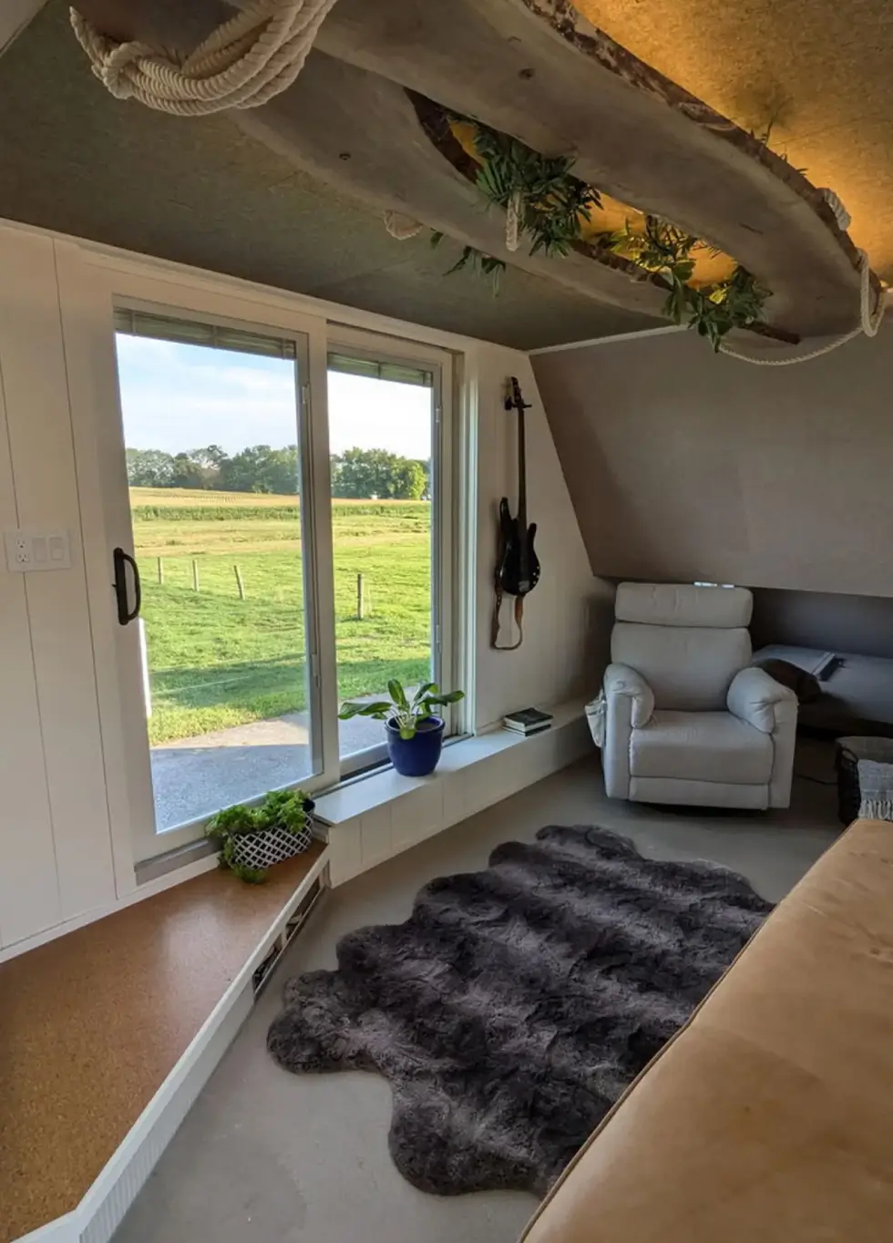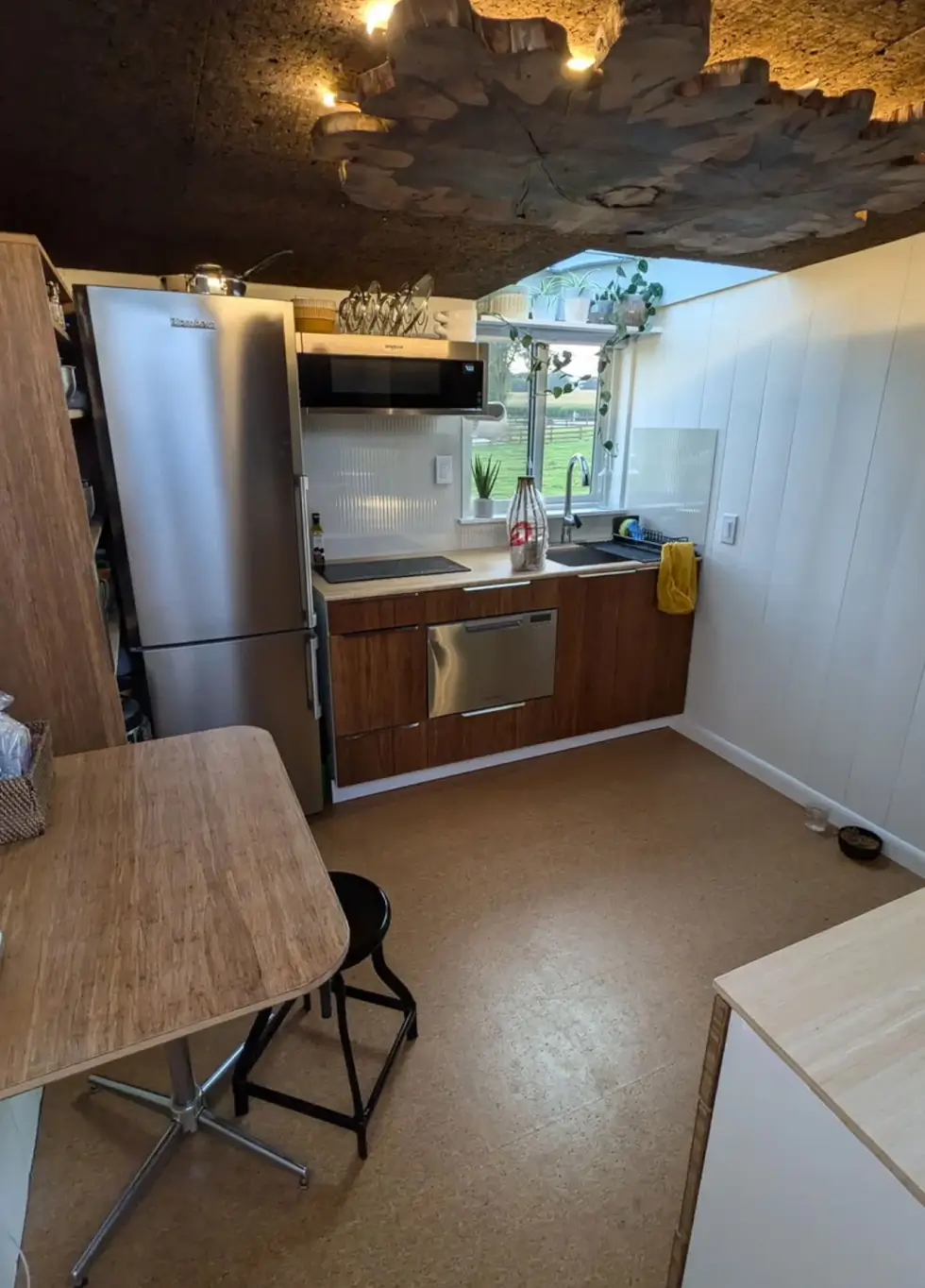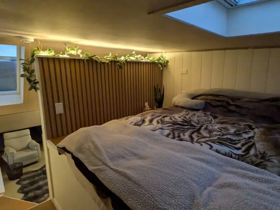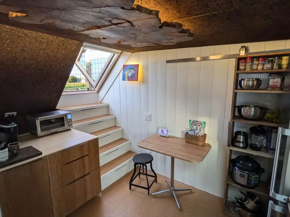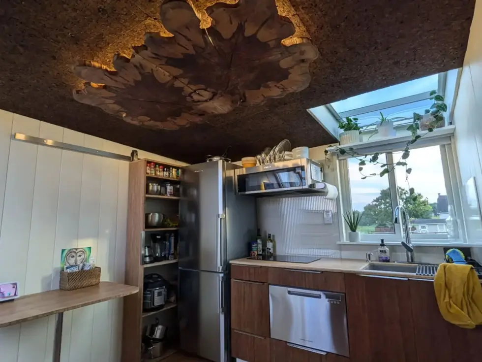 The bedroom has a double bed and has a skylight and enough headroom thanks to a lowered standing platform. Meanwhile, the fully equipped kitchen boasts cork and wood ceiling, and hanging planters for aesthetic appeal.