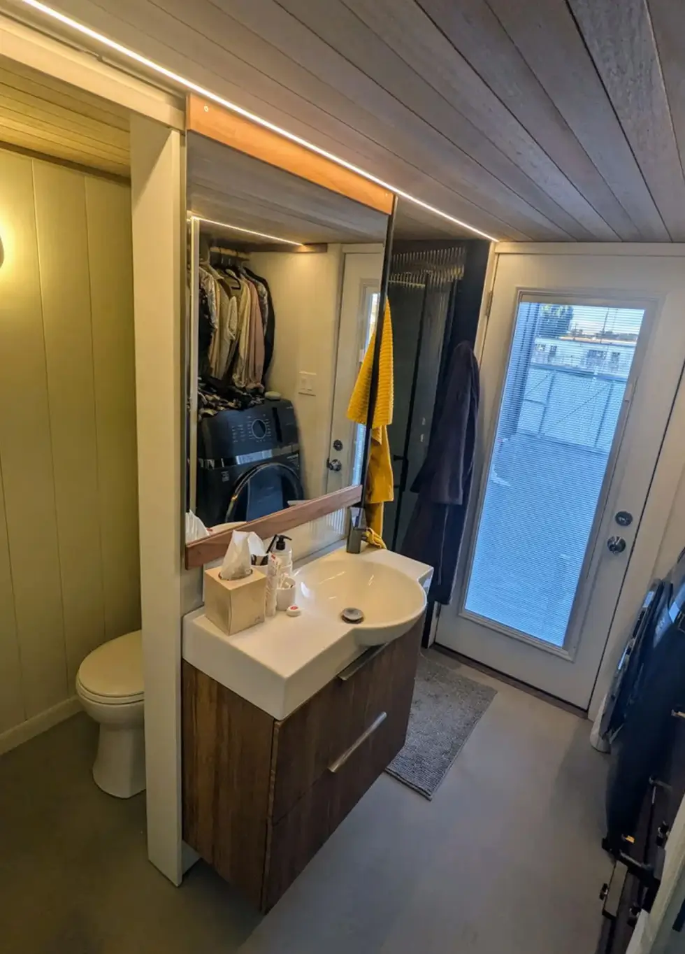 Likewise, occupying the ground floor is the bathroom which has a vanity sink, shower, toilet, and a washer/dryer. This area also has direct outside access through a secondary entrance door.  Moreover, this tiny house has two loft areas: one hosts the bedroom and the other the kitchen.