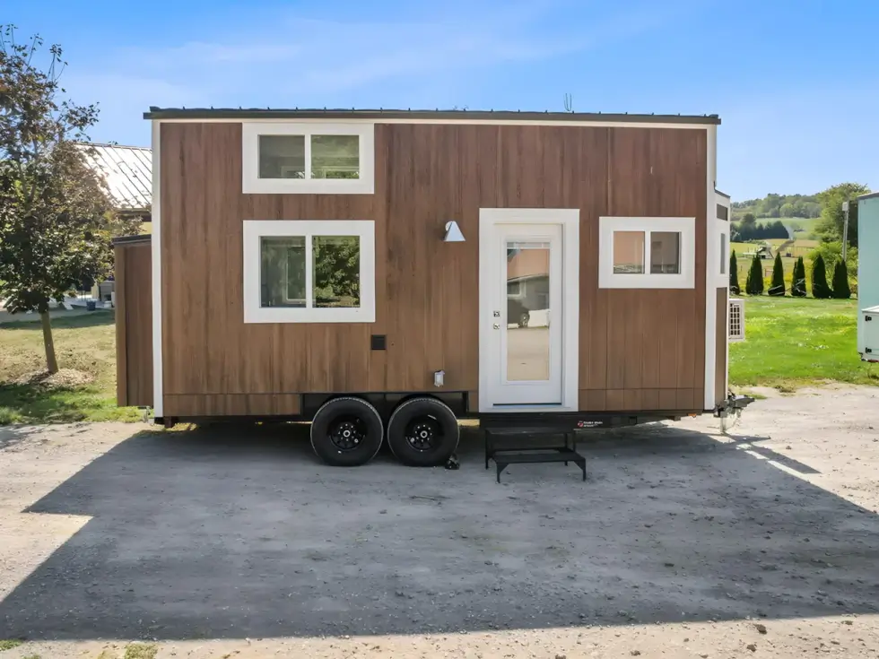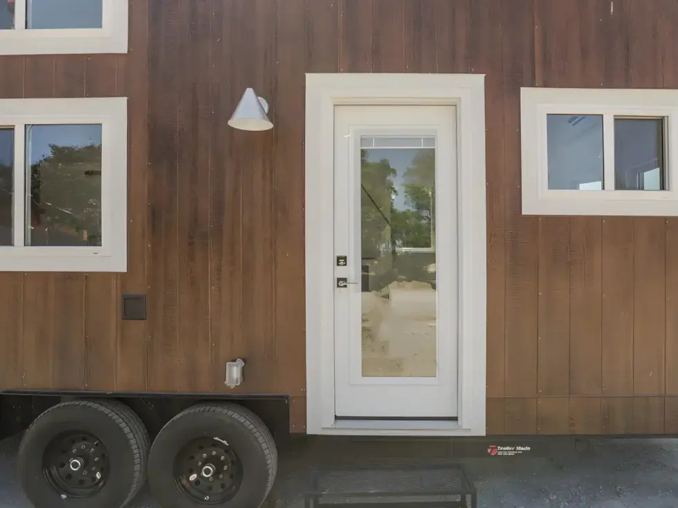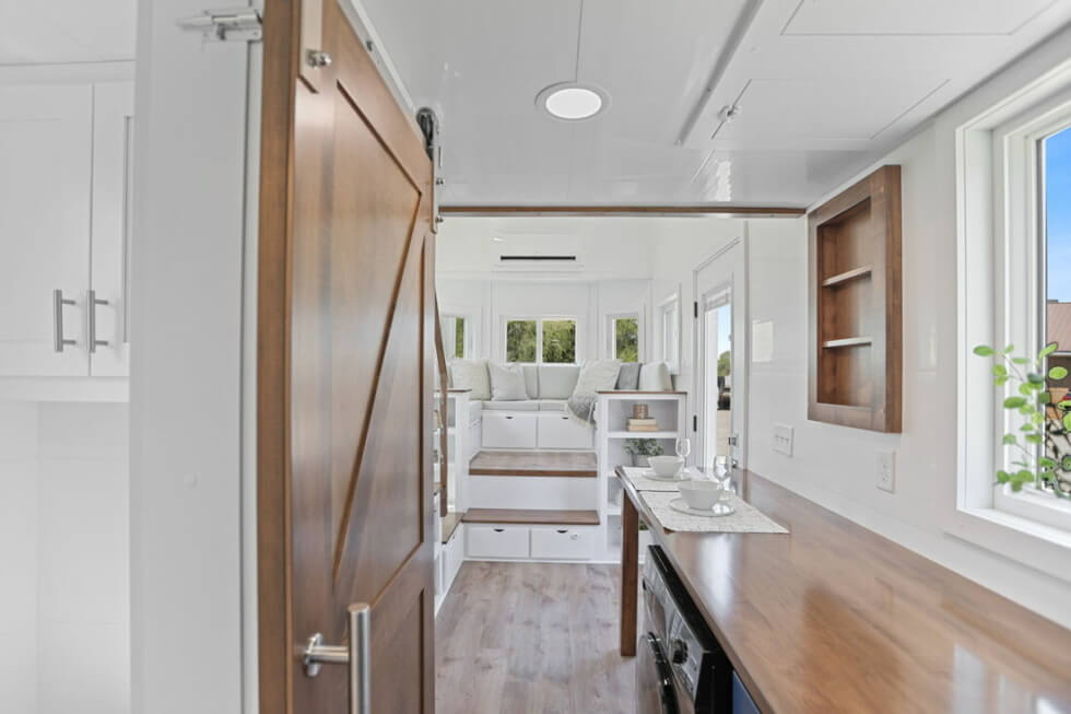 The Cerceaux also has built-in cabinetry and in-ceiling drop-down cabinets for storing spices. Meanwhile, the bathroom is next to the kitchen and accessible via a sliding barn-style door. It has a composting toilet, a shower, and a sink. This home is based on a double-axle trailer with operable windows and wood cladding. It runs on a roof-based solar panel and battery setup making it ideal for off-grid living.