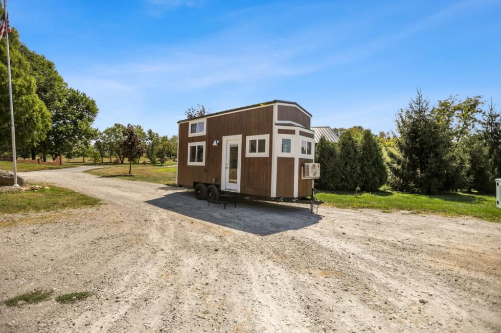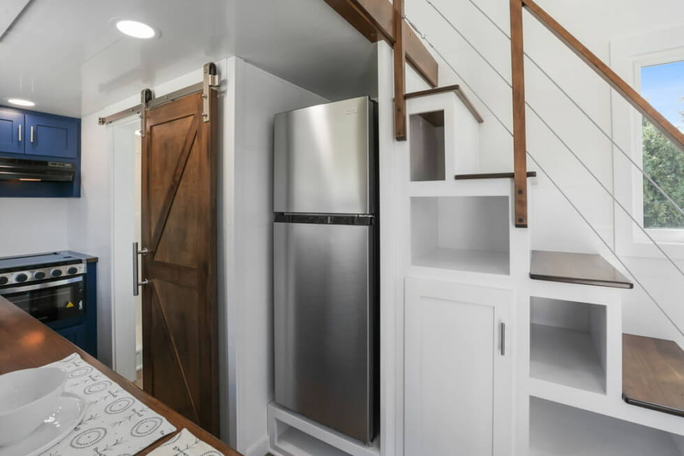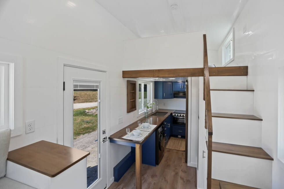 On the other end of this tiny home is a well-equipped and functional kitchen. A breakfast bar serves as a dining table and despite its compact footprint it has all the cooking/baking tools you need. It has a propane-powered four-burner cooktop with an electric oven, a steel sink, a washer/dryer, and a fridge/freezer.