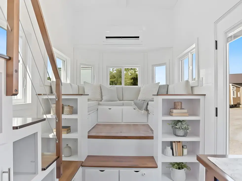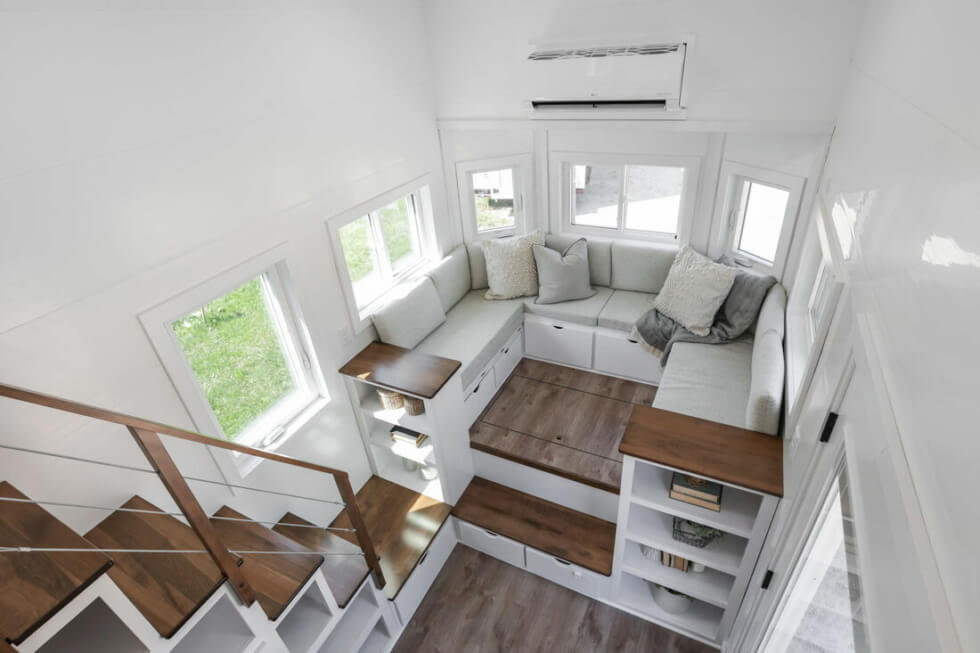 This home is good for a couple or a family of three at just 20 feet long. But it features a flexible layout with space to entertain guests. On one end is the living room with a built-in U-shaped storage-integrated seating arrangement. Small rectangular windows surrouned this area to naturally illuminate and open up the place.