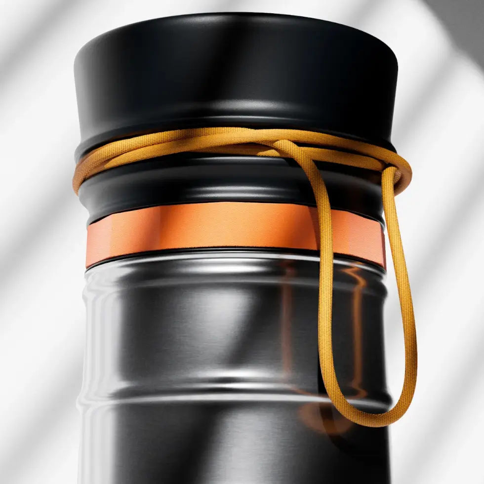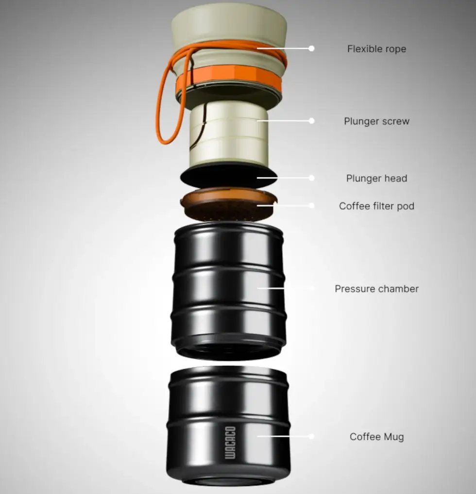 The flask comes with a flexible multi-purpose rope at the top so you can attach it to any gear or bag for easy access. It comes in three main compartments: plunger head (top), pressure chamber, and coffee mug. It separates into two parts for compact and organized storage, with the mug detached. The pressure chamber and the top can be stored together upside down.