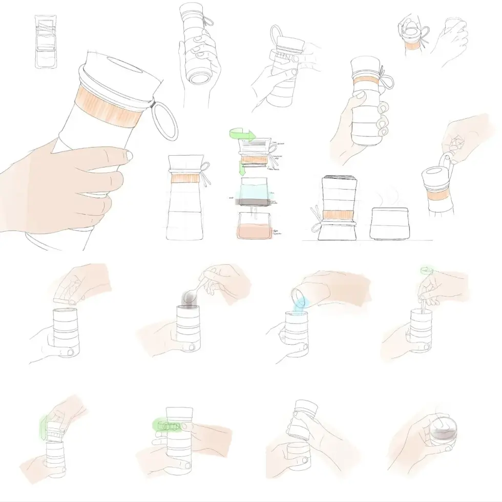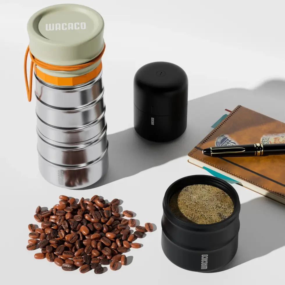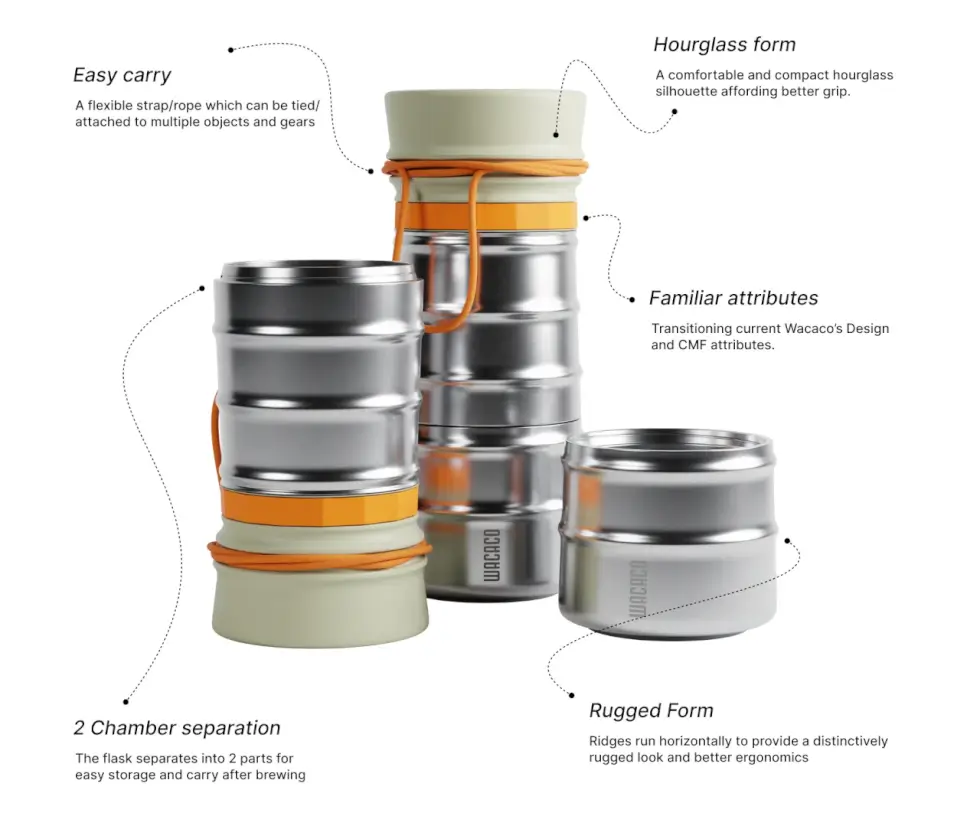 MokaMax is a conceptual coffee maker that takes design inspiration from Wacaco’s outdoor-ready, compact brewers. Designer Somya Chowdhary sees it as an extension of Wacaco’s product line. But she equipped it with a rugged and bold aesthetic and ensured ease of carry and storage.