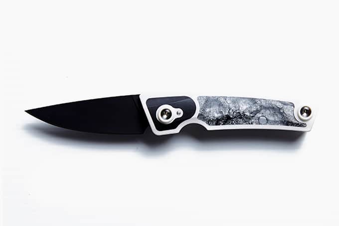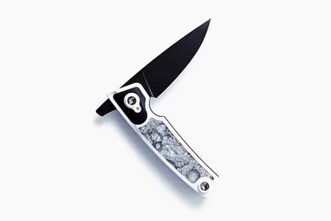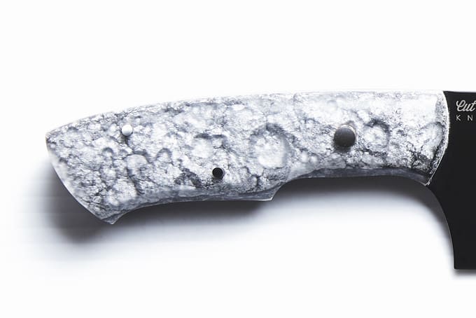 Next comes the friction folder with its AEBL steel blade that dons a coating of stealthy black Cerakote. Look closely and you can spot a special engraving hidden beneath the handle. These are the names of the heroes who perished during the early missions of the Apollo program. Another eye-catching detail on the Moon Landing Knives is the moonscape handles. Taking an actual scan of the moon and covering it with resin, the resulting work is stylish and awesome. Cut Throat Knives and WKRMN have really outdone themselves with this project.