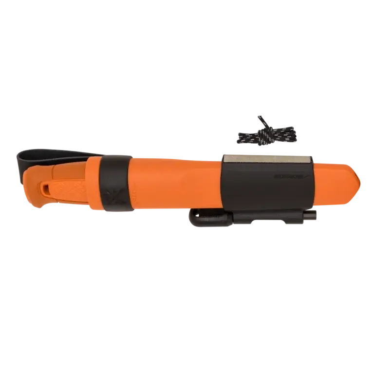 Described as “an ideal partner to the hunter and hiker,” the kit comes with a lightweight yet functional Swedish stainless steel Kansbol knife. It’s a 2.5mm thick and 109mm long straight blade (thus the “S” which stands for straight) with a TPE-rubber handle that’s ideal for just about anything you need it for from food prep to protection, and more.